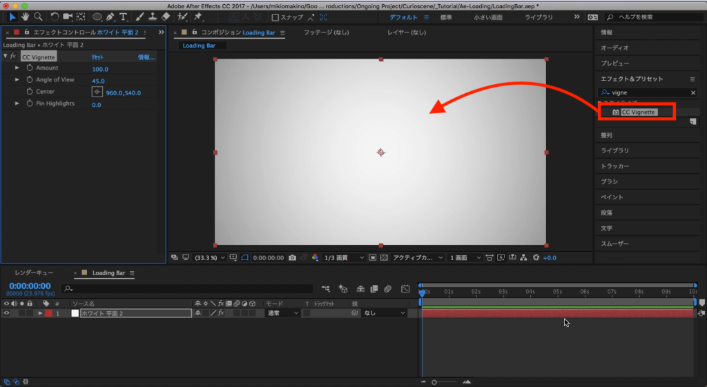 そしてその背景にビネットを加えるため、エフェクトタブから「Vignette」と検索して、「CC Vignette」を平面レイヤーにドラッグ・アンド・ドロップします。必要であればビネットの微調整をすると良いでしょう。