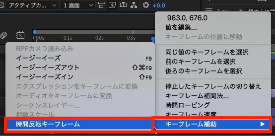 そして右クリック「キーフレーム補助」、「時間反転キーフレーム」を選択してキーフレームを反転させます。