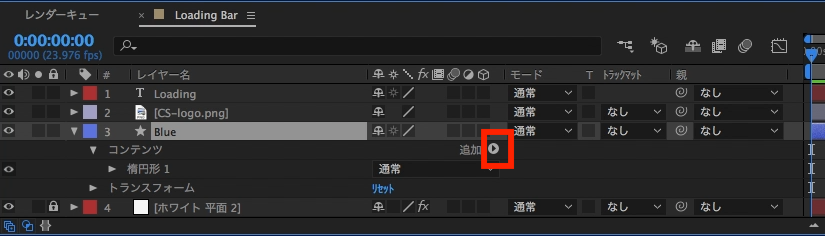 それではロゴの周りを走る枠線のアニメーションを追加していきましょう。こちらはキュリオシーンでも何回か紹介している「パスのトリミング」を使用した方法です。デザインしていた時に追加したシェイプはわかりやすいように「色」のレイヤー名に変更します。筆者の場合最初のレイヤーは青色なので「Blue」にしました。
