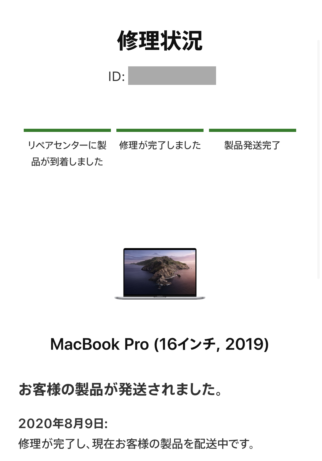 金曜日に問い合わせて土日のうちにバックアップなどの作業を行い、月曜日にMacBook Proをピックアップしてもらいました。火曜日にはリペアセンターに到着したとのメールが届き、修理が完了するまで待つ必要があります。