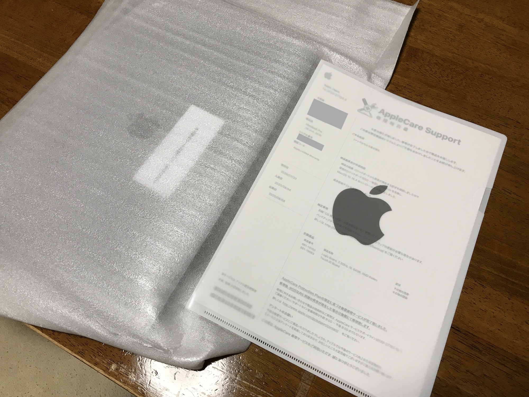 箱を開くとAppleロゴのクリアフォルダの中に入った修理報告書がありました。