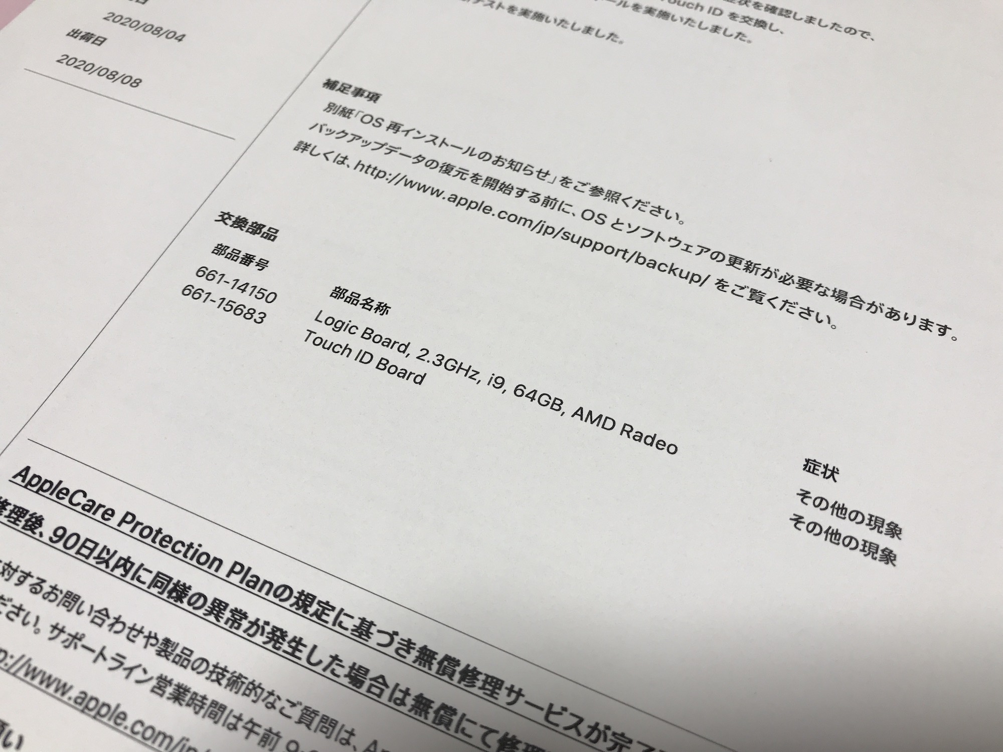筆者のパソコンでは症状の確認が取れたため、ロジックボードとTouch IDのパーツが交換されています。