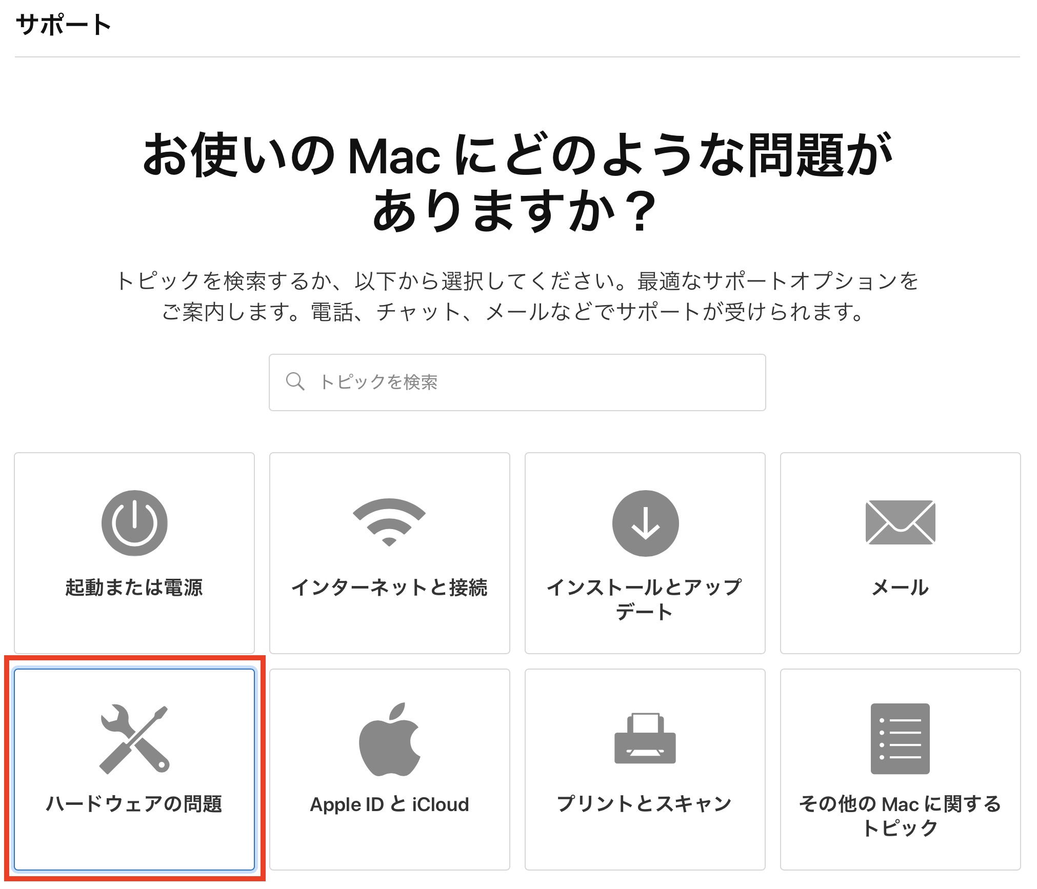 サポートページを開き、「Mac」を選択後、「お使いのMacにどのような問題がありますか?」のページに移るので、「ハードウェアの問題」をクリックします。