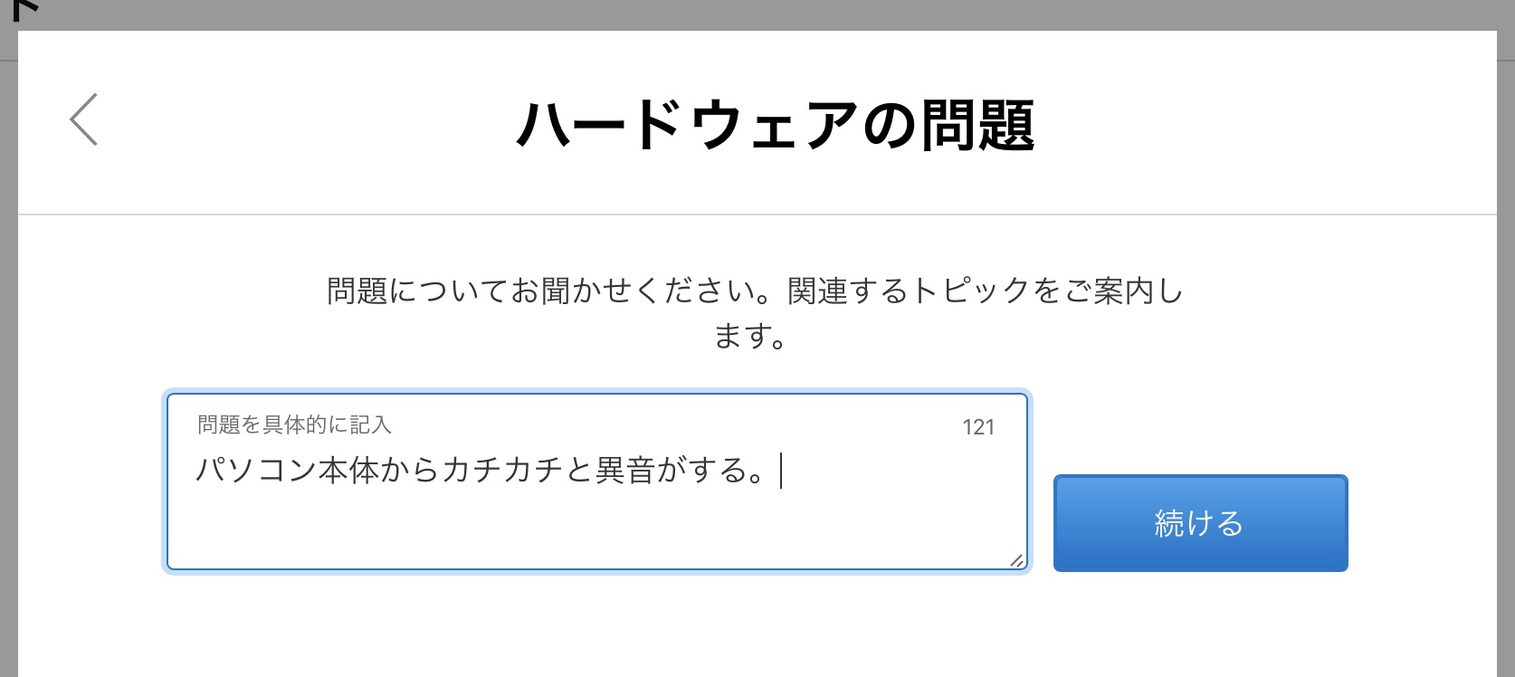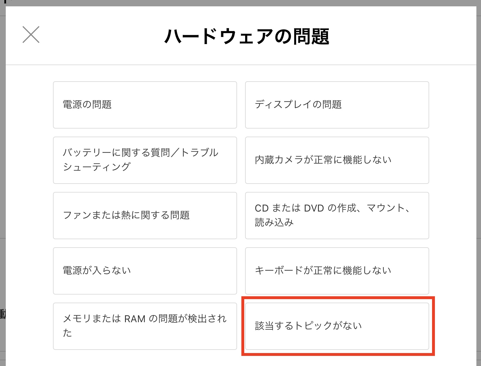すると色々な項目が出てくるのですが、カチカチの異音については見当たらないので「該当するトピックがない」を選びましょう。