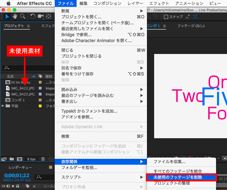 「未使用のフッテージを削除」を選択することで、コンポジションで使用されていない画像や映像素材などが削除されるようになります。