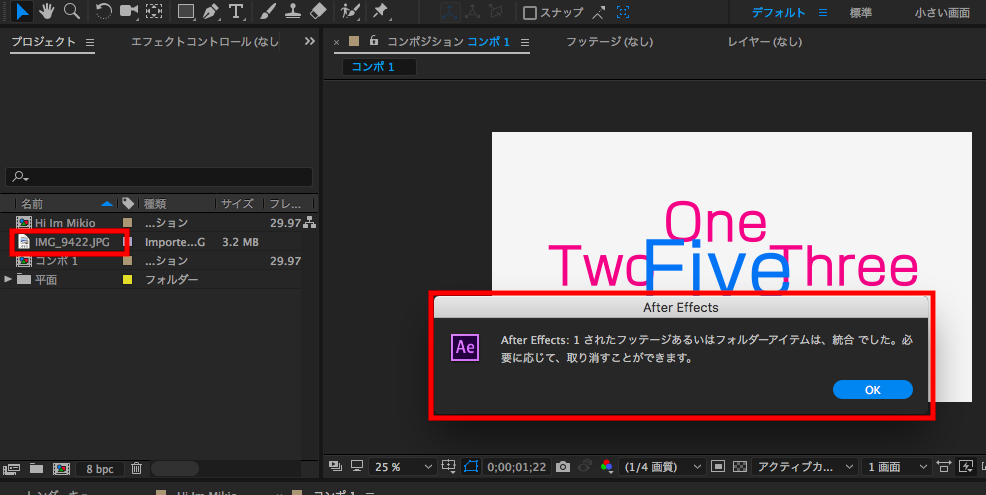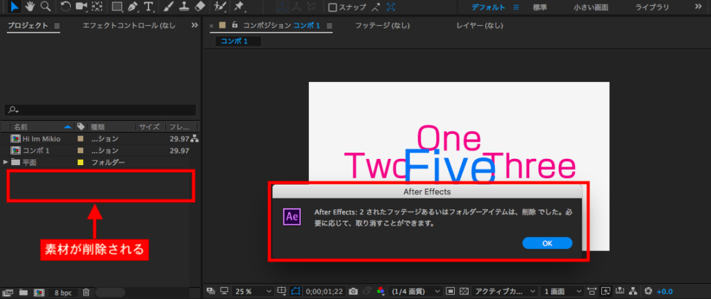 クリックすると警告が表示されるのですがキャンセルのオプションが存在しません。そのため「OK」クリック後すぐに削除が反映されるのでコンポジションには現在使用していないけれど、バックアップとして素材を残している場合などがある場合は注意が必要です。
