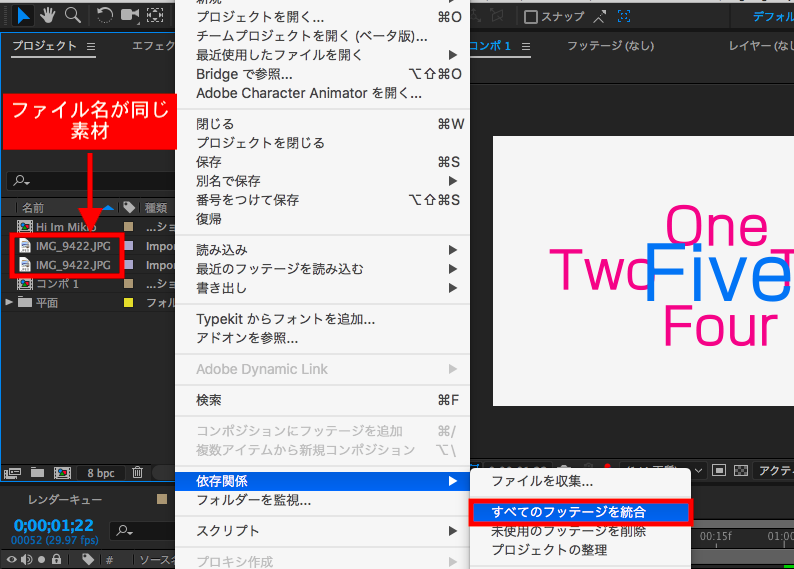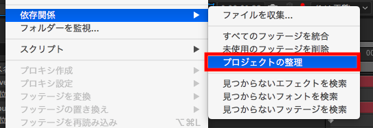 依存関係はAfter Effectsの上部メニューにある「ファイル」から「依存関係」を選ぶと、「ファイルを収集」の下に「全てのフッテージを統合」、「未使用のフッテージを削除」、「プロジェクトの整理」などのオプションを見つけることが出来ます。