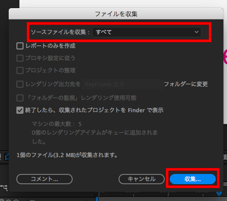 ひとまず、「未使用のフッテージを削除」や「全てのフッテージを統合」でプロジェクトの素材を整理した後、その上にある「ファイルを収集」をクリックし、新しいロケーションにプロジェクトをコピーします。