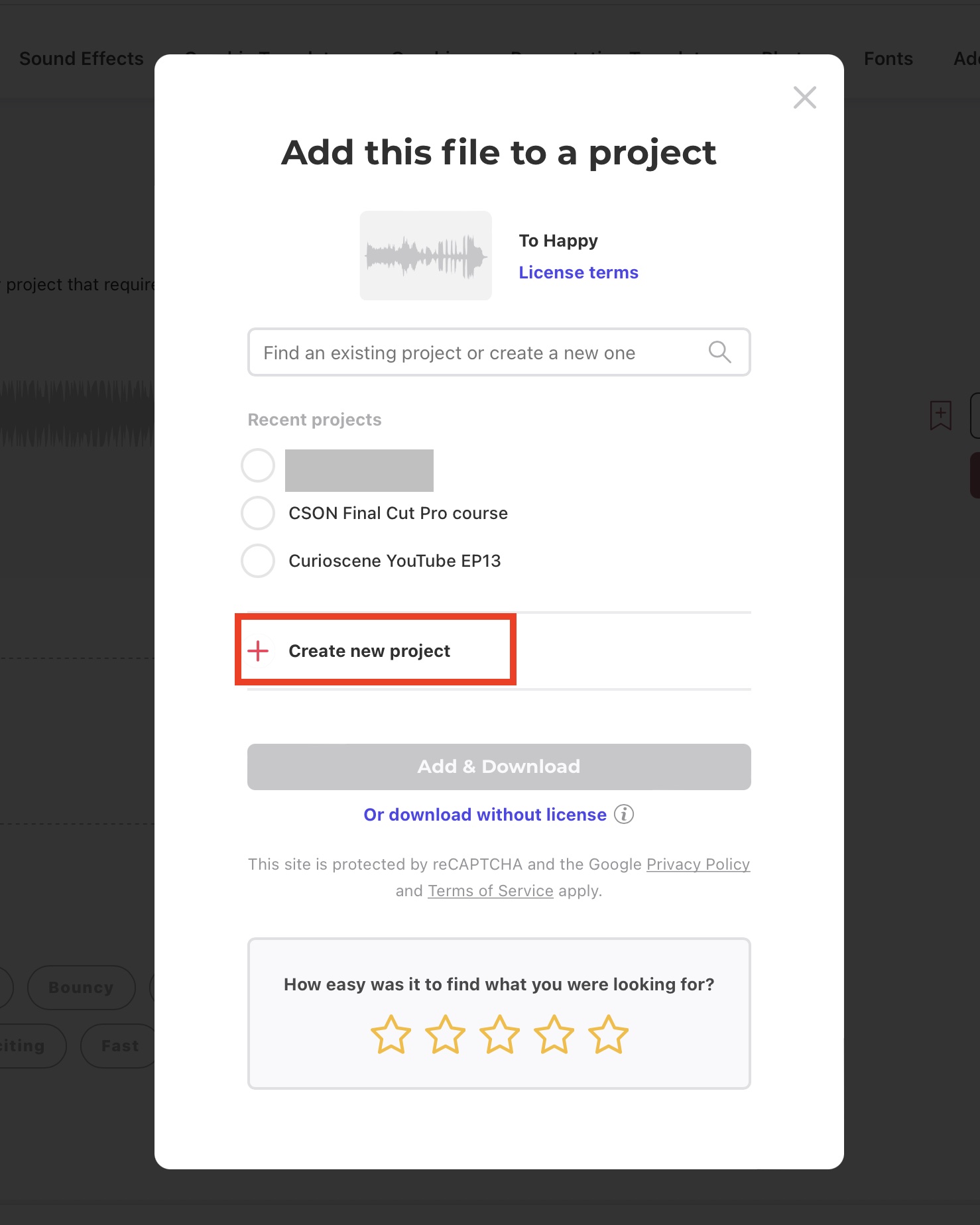 「Download」のボタンをクリックすると「Add this file to a project」の画面が表示されます。「Create new project」からプロジェクト名を入力しましょう。