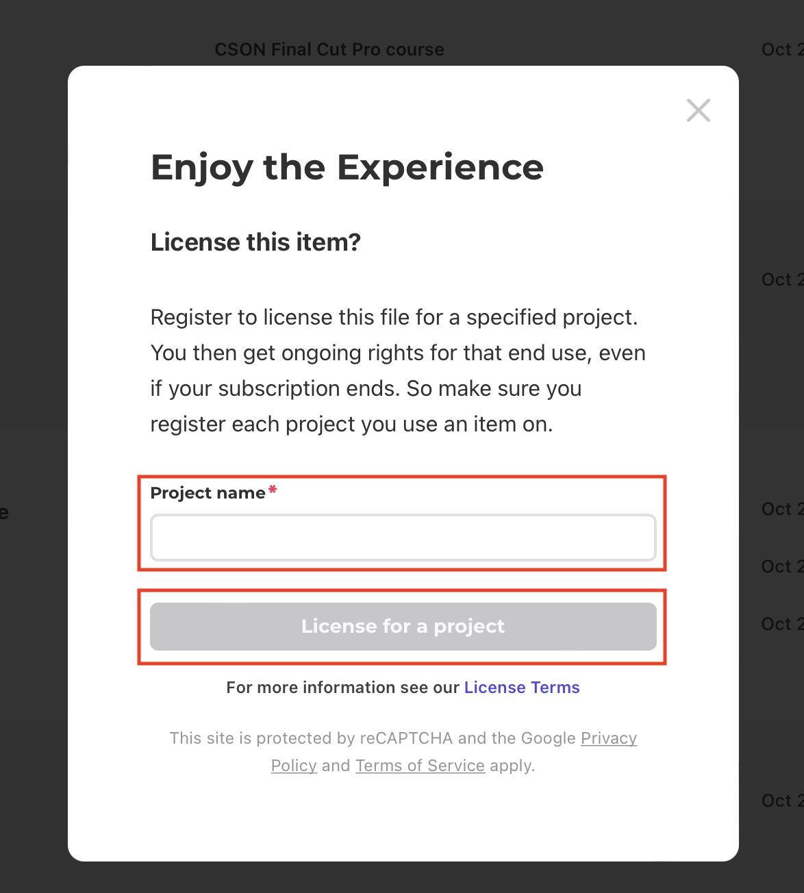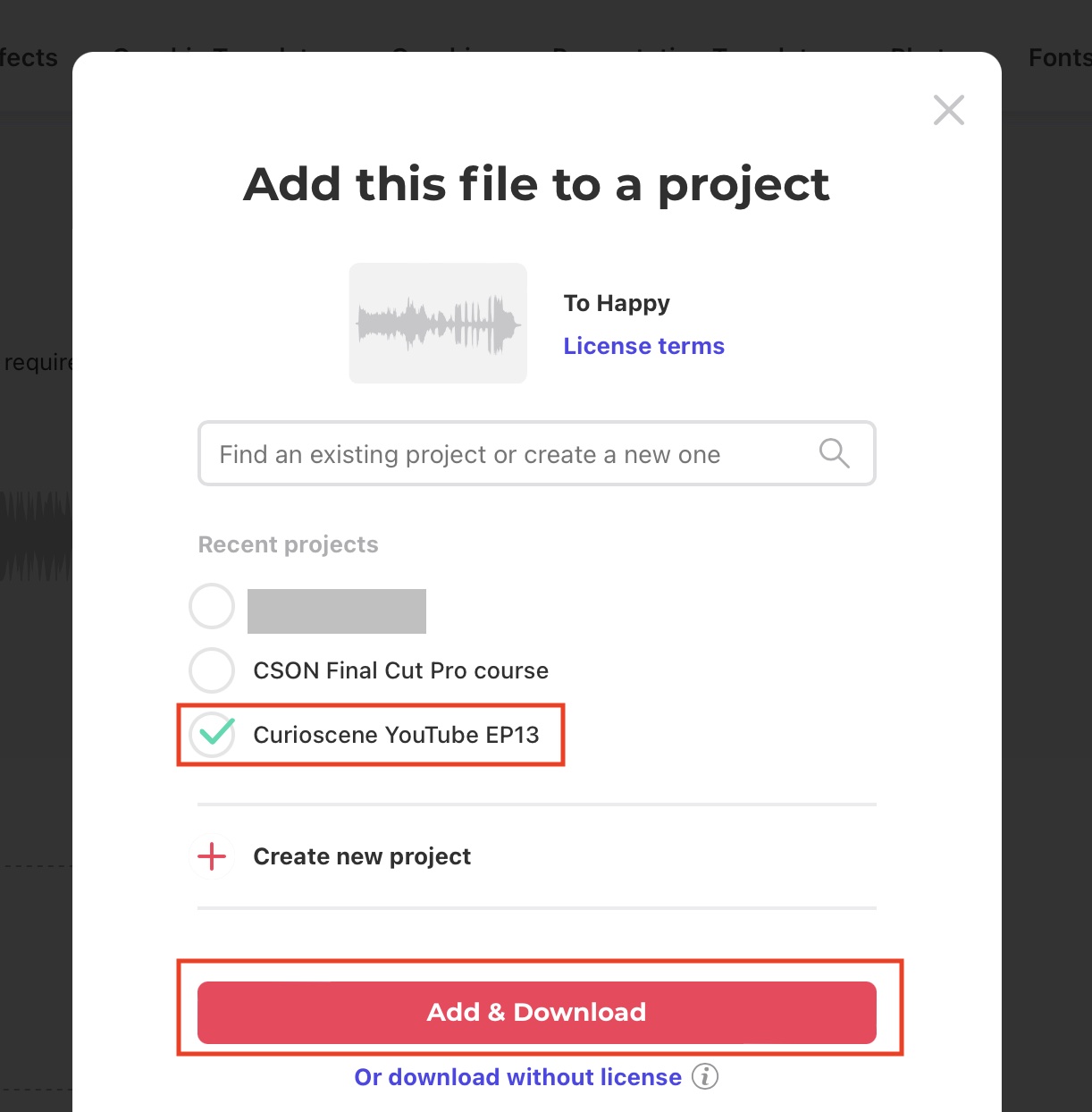 「Download」はウォーターマークなしのアイテムをダウンロード出来ますが、ダウンロード時にプロジェクトの登録を行う必要があります。