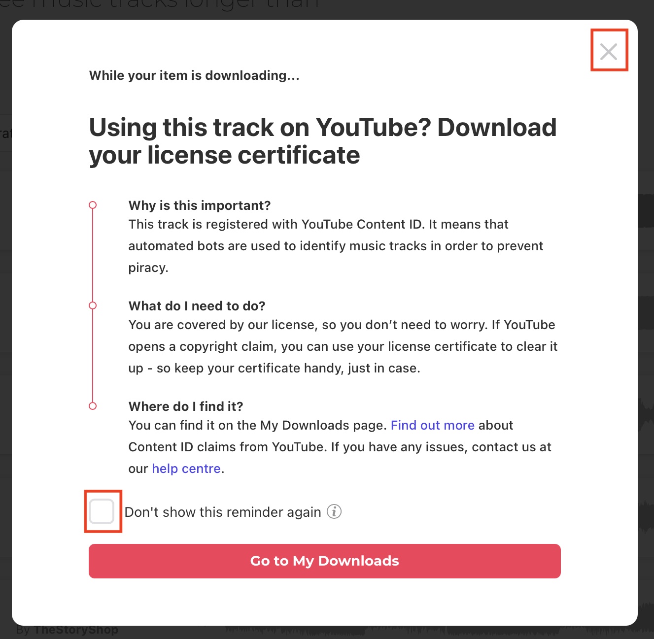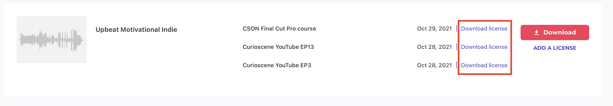 YouTubeでアップロードした際に著作権の申し立てが現れた場合はEnvato Elementsのダウンロードページからライセンスを入手し、YouTubeの編集画面から登録する必要があります。