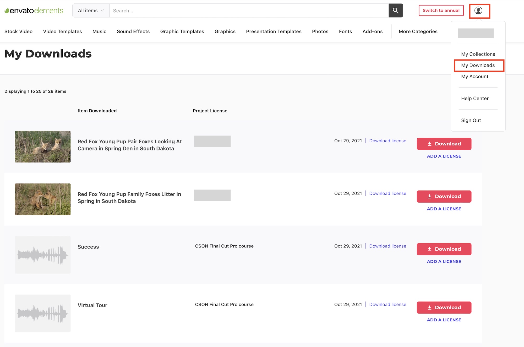 YouTubeなどライセンスの登録が求められた場合はEnvato Elementsの右上にあるユーザーアイコンにある「My Downloads」をクリックしてダウンロードページを開きます。