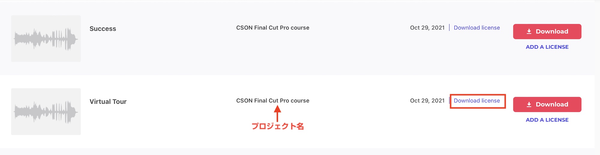同じアイテムに複数のプロジェクトが登録されている場合はこのようにプロジェクトごとにライセンスが用意されるようになります。