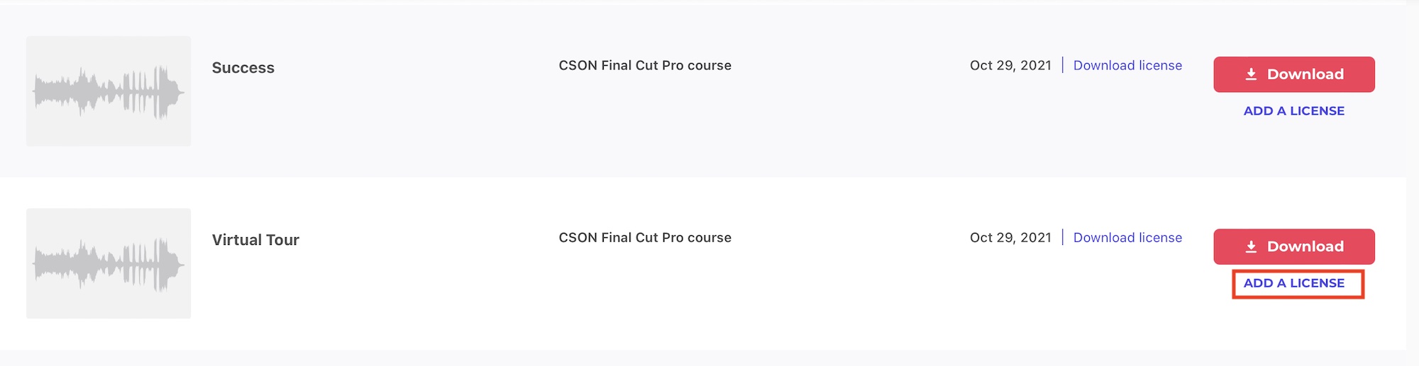 各アイテムにある「Download license」からライセンスを入手できます。