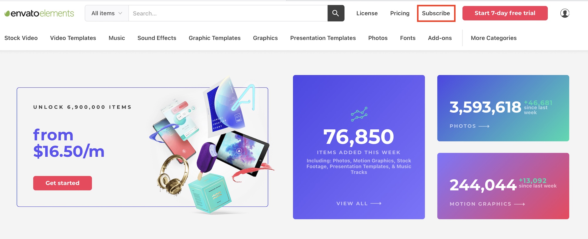 アカウントを作成した後はEnvato Elementsのサブスクリプションに登録することで利用可能になります。ログインした状態で「Subscribe」をクリックします。