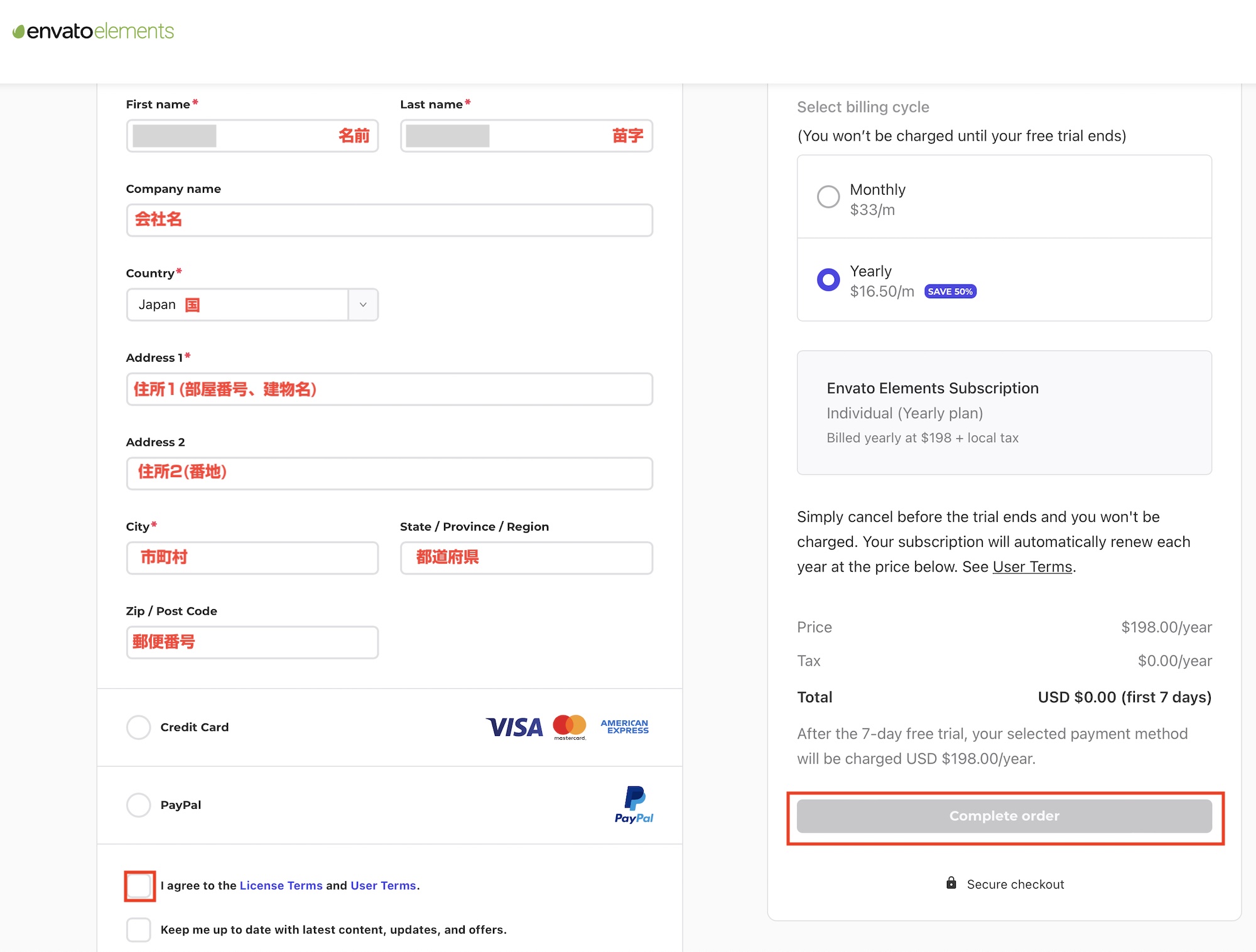 請求者と決済情報の入力が求められるので入力します。Envato Elementsを初めて利用する場合は7日間のトライアル(試用期間)があるので、トライアル期間中であれば支払いが行われることはありません。