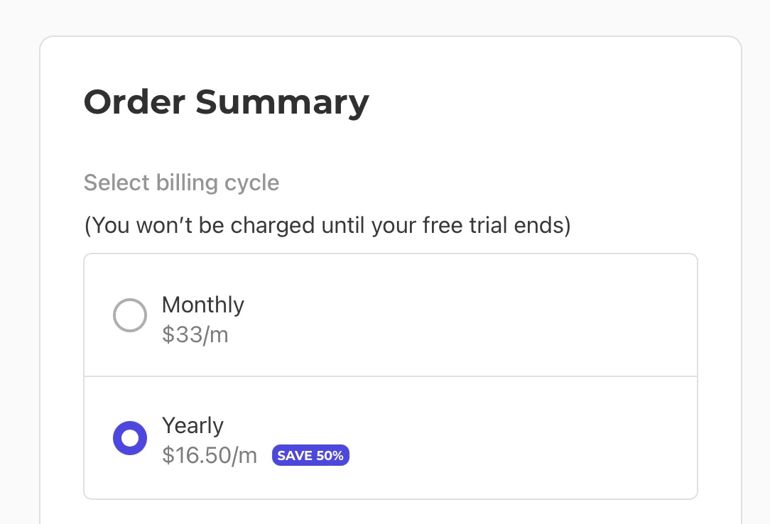 年払いではなく月払いにしたい場合は「Monthly 33/m」を選択すると良いでしょう。情報と支払いサイクルを選んだ後は「Complete order」をクリックします。