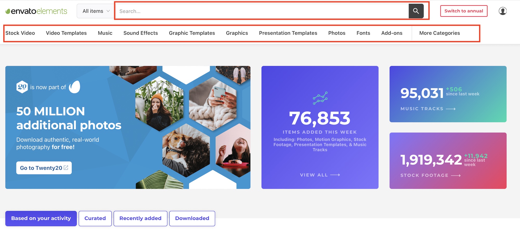 Envato Elementsでのアイテムの入手方法はEnvato Marketと似ています。メインメニューにあるカテゴリ一覧からStock Video(ストックビデオ)、Music(音楽)のように入手したいアイテムのカテゴリを選択するか、上部の検索窓からキーワードを入力して検索を行えます。