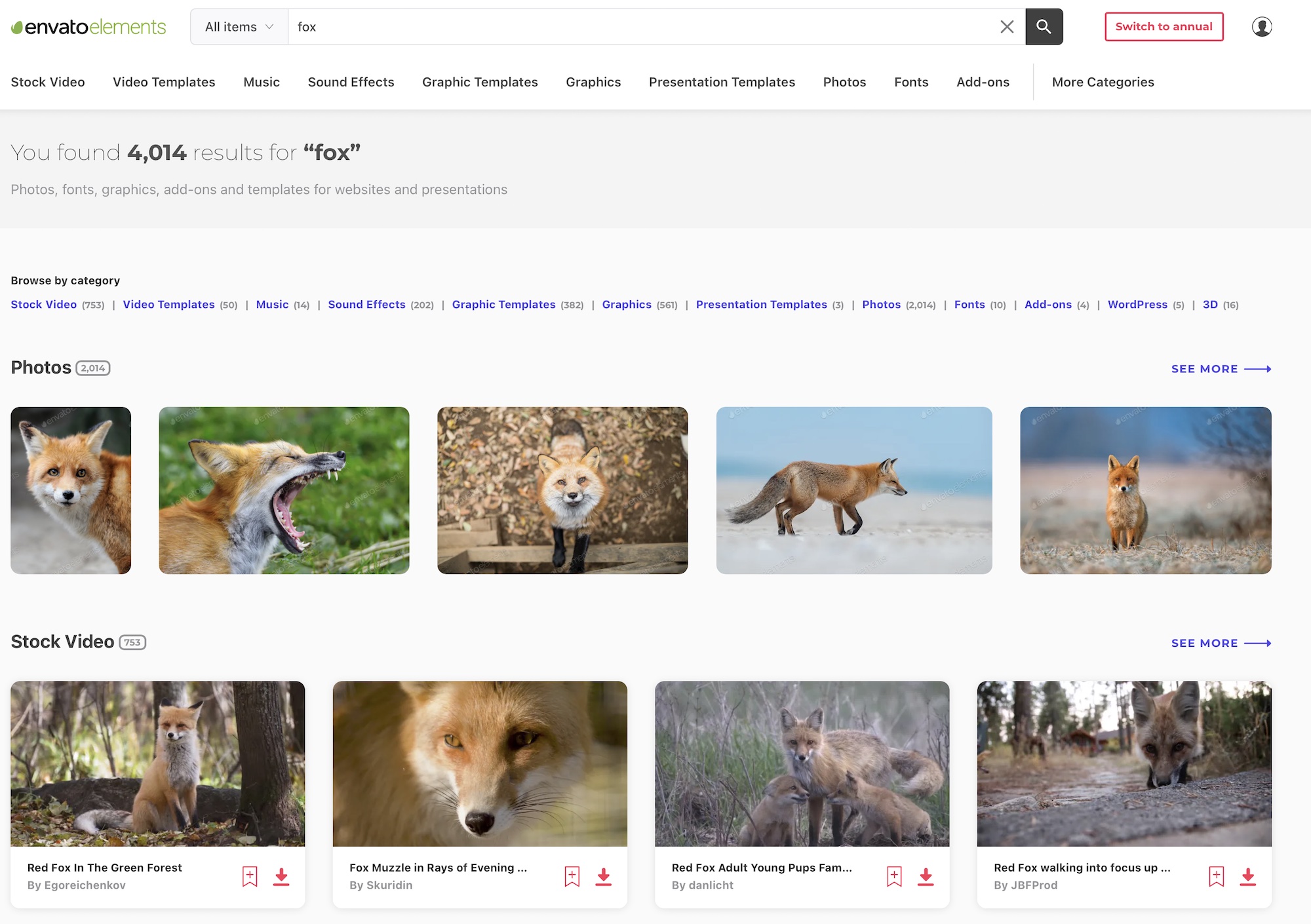 Envatoで提供しているサービスは日本語が用意されていないので、基本英語での検索、入力になりますが「Fox(キツネ)」、「Happy(楽しい)」、「Wedding(ウェディング)」などシンプルなキーワードを入力するだけで簡単にアイテムを見つけることが可能です。