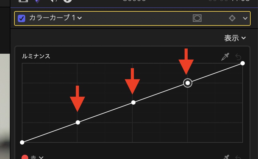 ルミナンスカーブに3つのコントロールポイントを追加し、一番左のシャドウのコントロールポイントを少し上に動かし、追加した3つのポイントはS字になるように調整します。この際0 IRE以下、100 IRE以上にならないようにRGBオーバーレイを確認しながら調整すると良いでしょう。