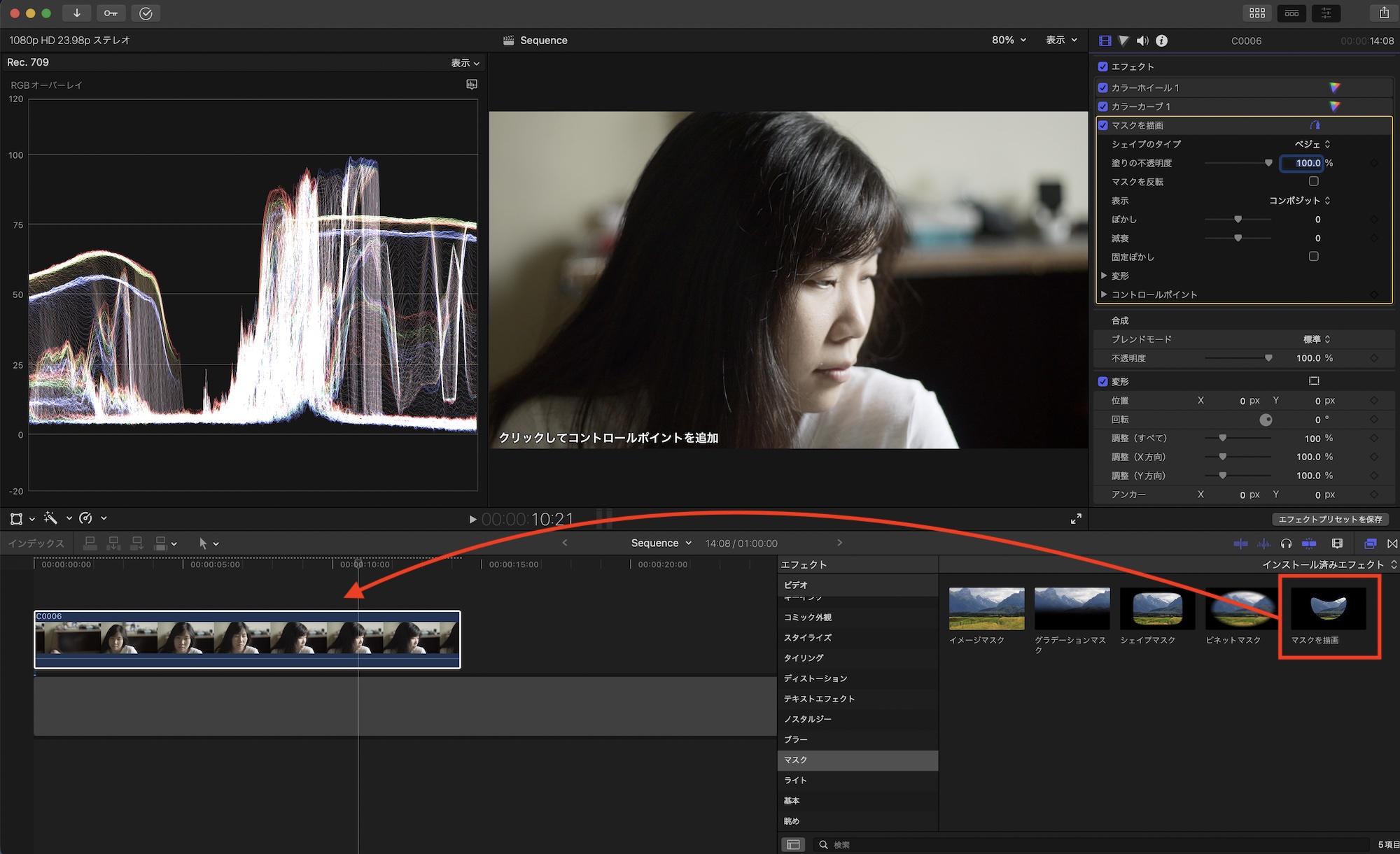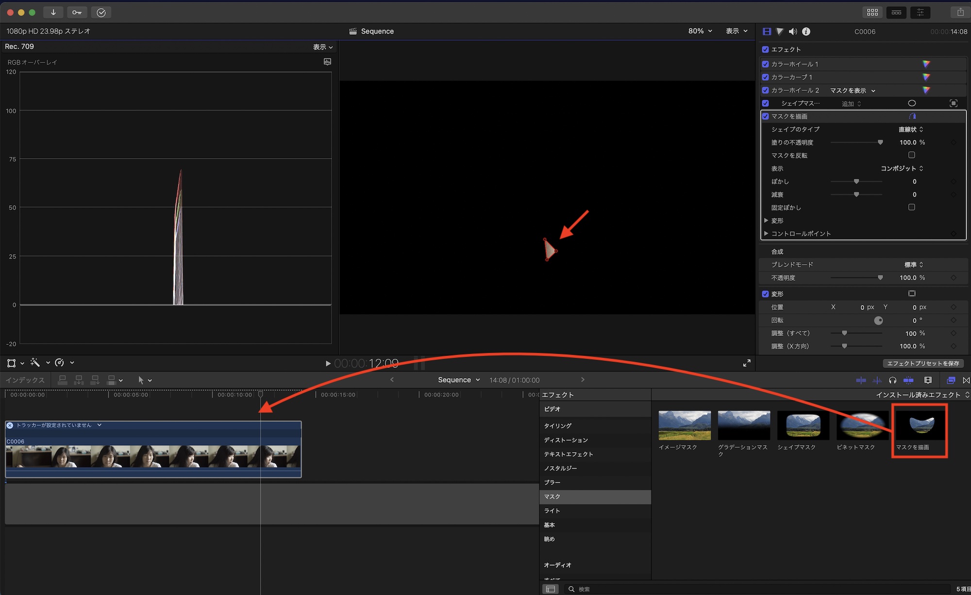 次に「マスクを描画」をクリップに追加し、先ほどのホワイトバランスの時同様に顔の一部をマスクします。