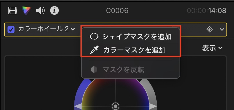 クリップに「カラーホイール」を追加するか、カラーインスペクタから「カラーホイール」を選択し、エフェクトを追加します。今回基本補正には「カラーホイール」を使用していますが、カラーボードまたはカラーカーブでも代用可能です。