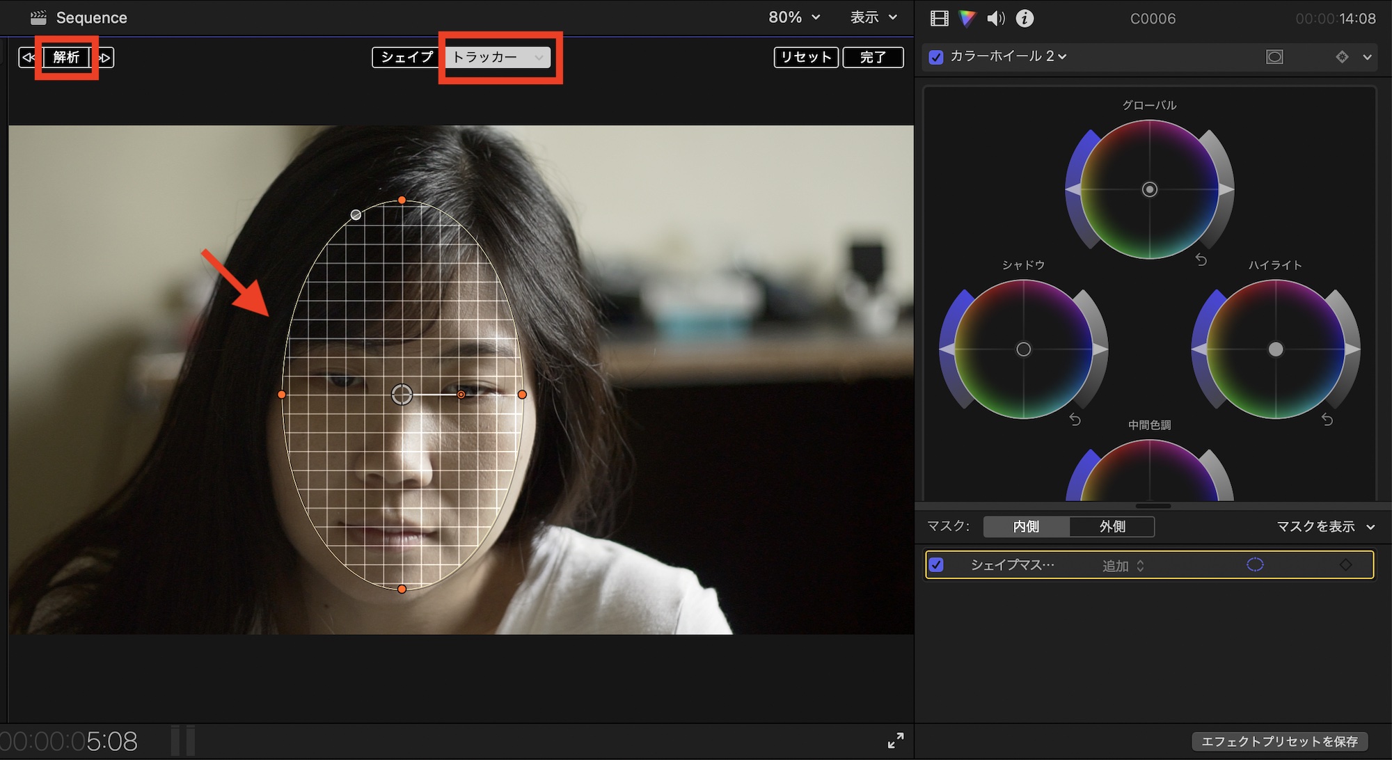 このフレームではきれいにマスクが行われているものの、正面を向いている場合影の影響でマスクが崩れてしまうので、今回はシェイプマスクとトラッカーを使って顔の色補正を行います。