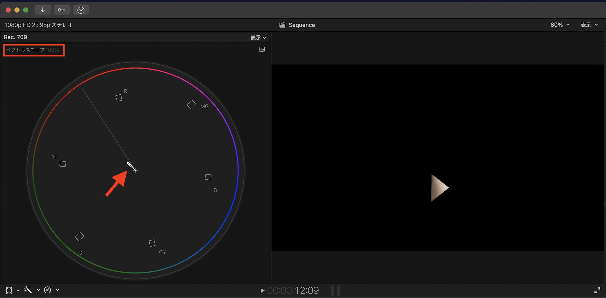 左側のモニターを「ベクトルスコープ」に切り替え、スキントーンを確認していると、スキントーンのラインから離れており、正しいスキントーンになっていないのがわかります。