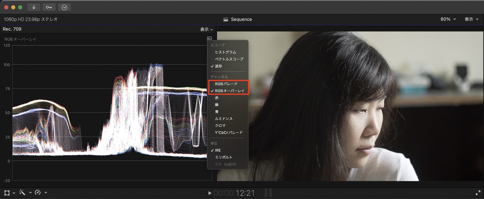 ビューアを確認してみると明るさは問題ないように見えるものの、RGBオーバーレイではフレームの一部が100 IREを超えている部分があります。IREは端的に言えば0が完全な黒、100が完全な白となり、この数値を超えてしまうとディテールを失う可能性があるので、可能な限り1-99 IREの間に収めるのがベストです。