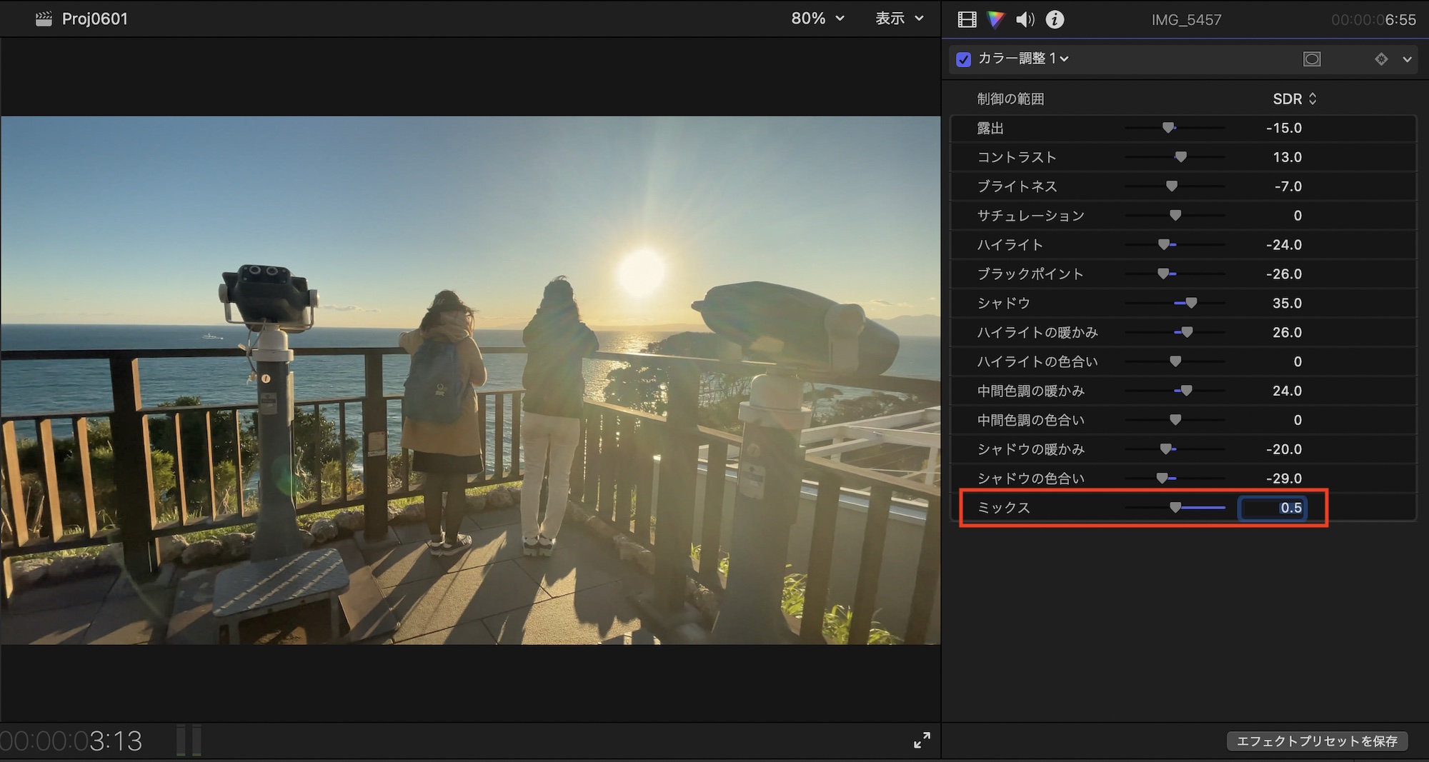 「ミックス」では適用した色補正の強度を調整します。補正後の色の効果が強すぎると感じた時に弱めるなど、微調整に最適です。