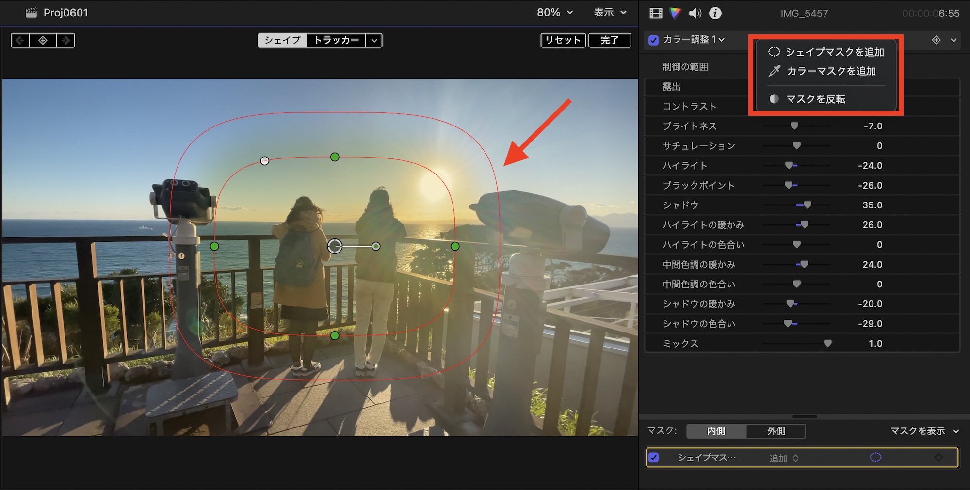 カラー調整のエフェクトはシェイプマスクとカラーマスクが利用できるので、特定の範囲のみの色補正を行いたい場合などに便利です。