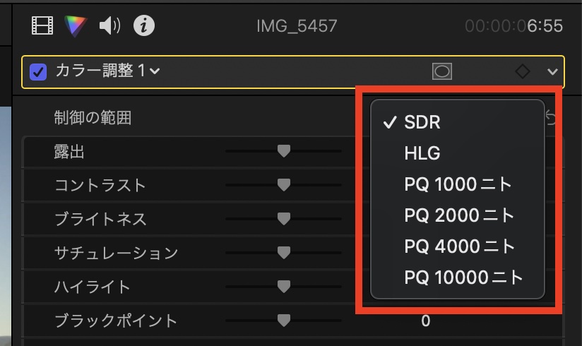 「制御の範囲」では色補正するクリップの調整する範囲を決めます。AppleによるとこのエフェクトははHDRクリップに特化したものではあるものの、HDRではないSDRのクリップでも利用できるようになっています。