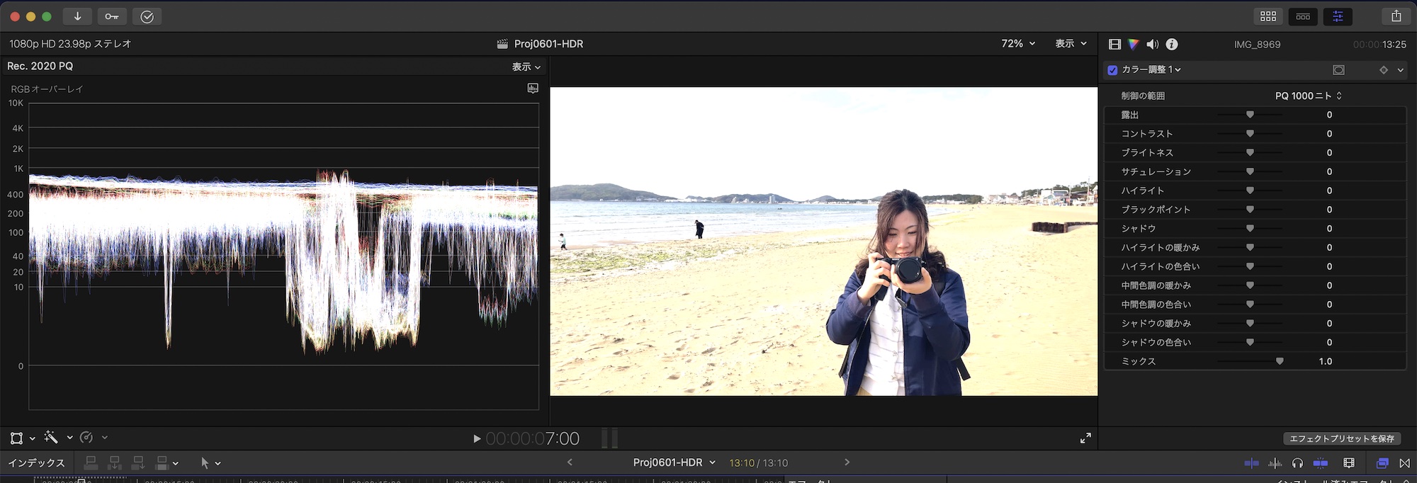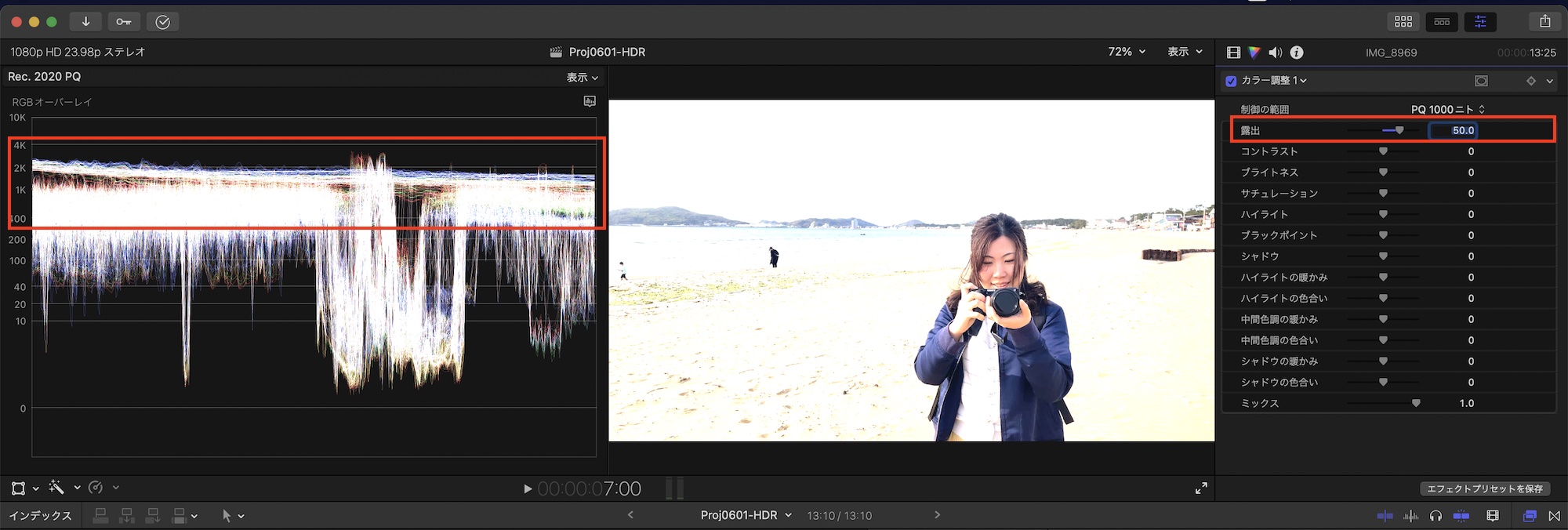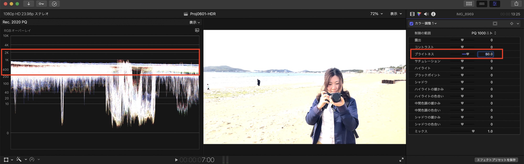 SDRの場合、「露出」と「ブライトネス」はどちらを操作しても基本的に同じ感じになりますが、HDRクリップの場合は「ブライトネス」が全体的な明るさを調整し、「露出」はハイライトを中心に明るさが調整できます。