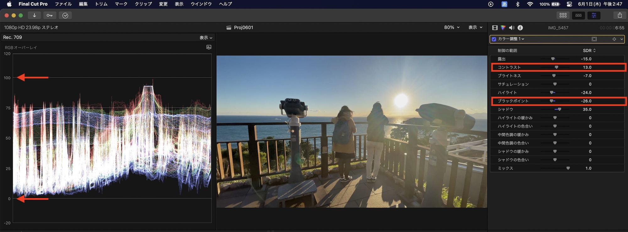 「コントラスト」と「ブラックポイント」を使って黒い範囲の強度を調整し、好みのコントラストを作成できます。白飛びおよび黒つぶれを発生させないように、波形を確認しながら0 IREから99 IREに収めるようにしましょう。