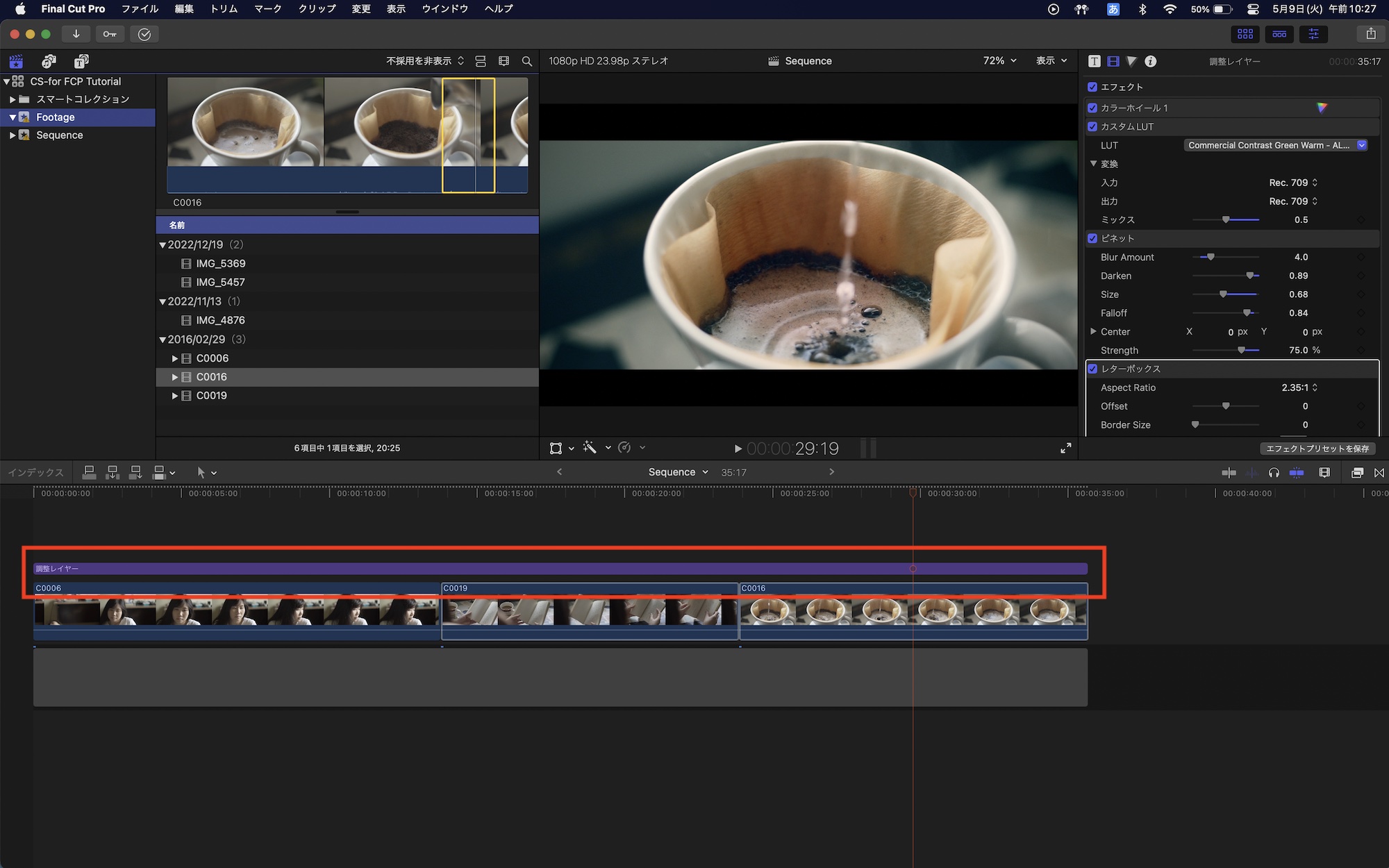 調整レイヤーを使うことで、他のクリップにも同じカラーグレーディングを適用できるので、再調整などが楽になります。もちろん、クリップごとにグレーディングを行うこともできますが、筆者的にはこの方法でのグレーディングをおすすめします。