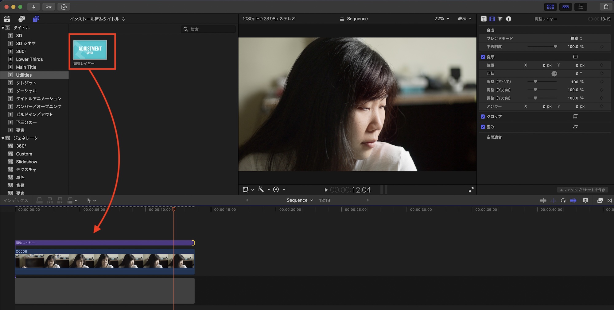 筆者はシーンに合わせたグレーディングを行いたいと考えているので、今回はMotionで作成された調整レイヤーにカラーエフェクトを追加していきます。この調整レイヤーはデフォルトでは用意されていないツールなので、「色補正をまとめて適用!調整レイヤーの追加とMotionで自作する方法」の記事を参考にして調整レイヤーを追加するようにしてください。