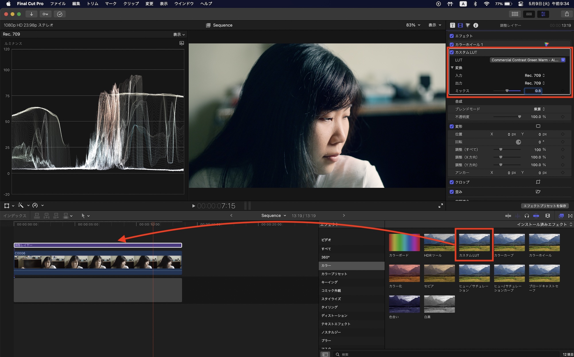 Final Cut ProにおけるLUTの追加や調整の方法は「LOG撮影のクリップやグレーディング用LUTの追加と適用方法とは?」に詳しく書いているので、気になる方は合わせて読んでみてください。