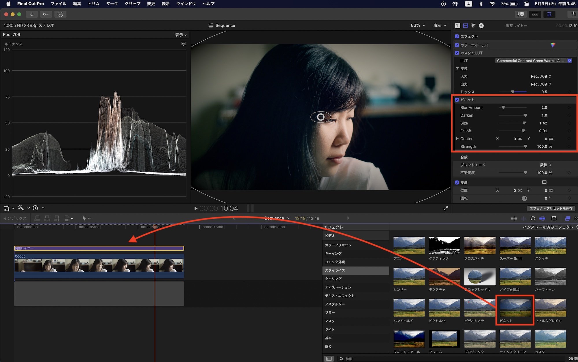 エフェクトブラウザを開き、「すべてのビデオとオーディオ」を選択した上で検索画面から「ビネット」を入力するか、「スタイライズ」の中にある「ビネット」のビデオエフェクトを調整レイヤーまたはクリップに追加します。