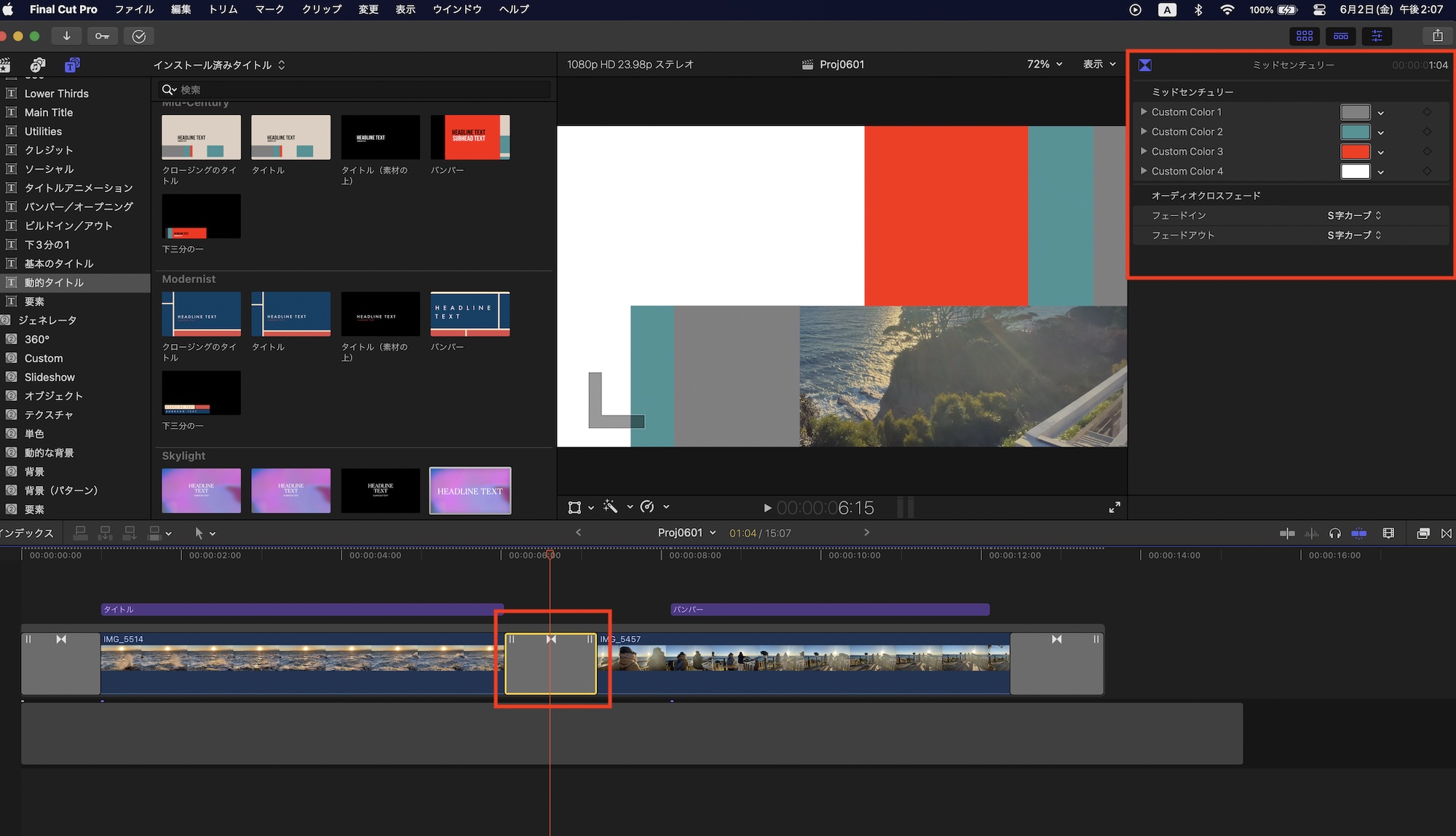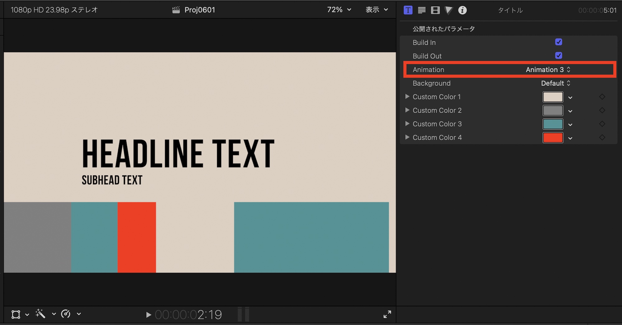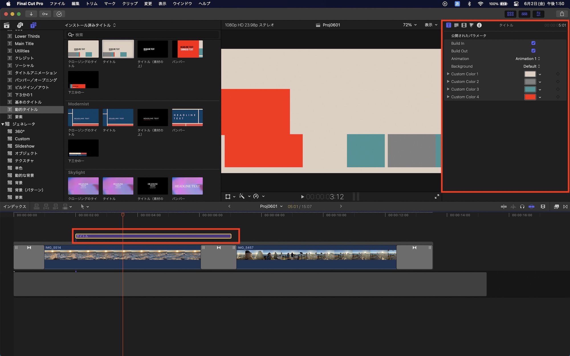 動的タイトルと動的トランジションはカラフルな色が使われており、デフォルトのままでもいい感じになると思いますが、別の色に変更したい場合はタイトルまたはトランジションを選択した上で、タイトルインスペクタまたはトランジションインスペクタから調整できます。