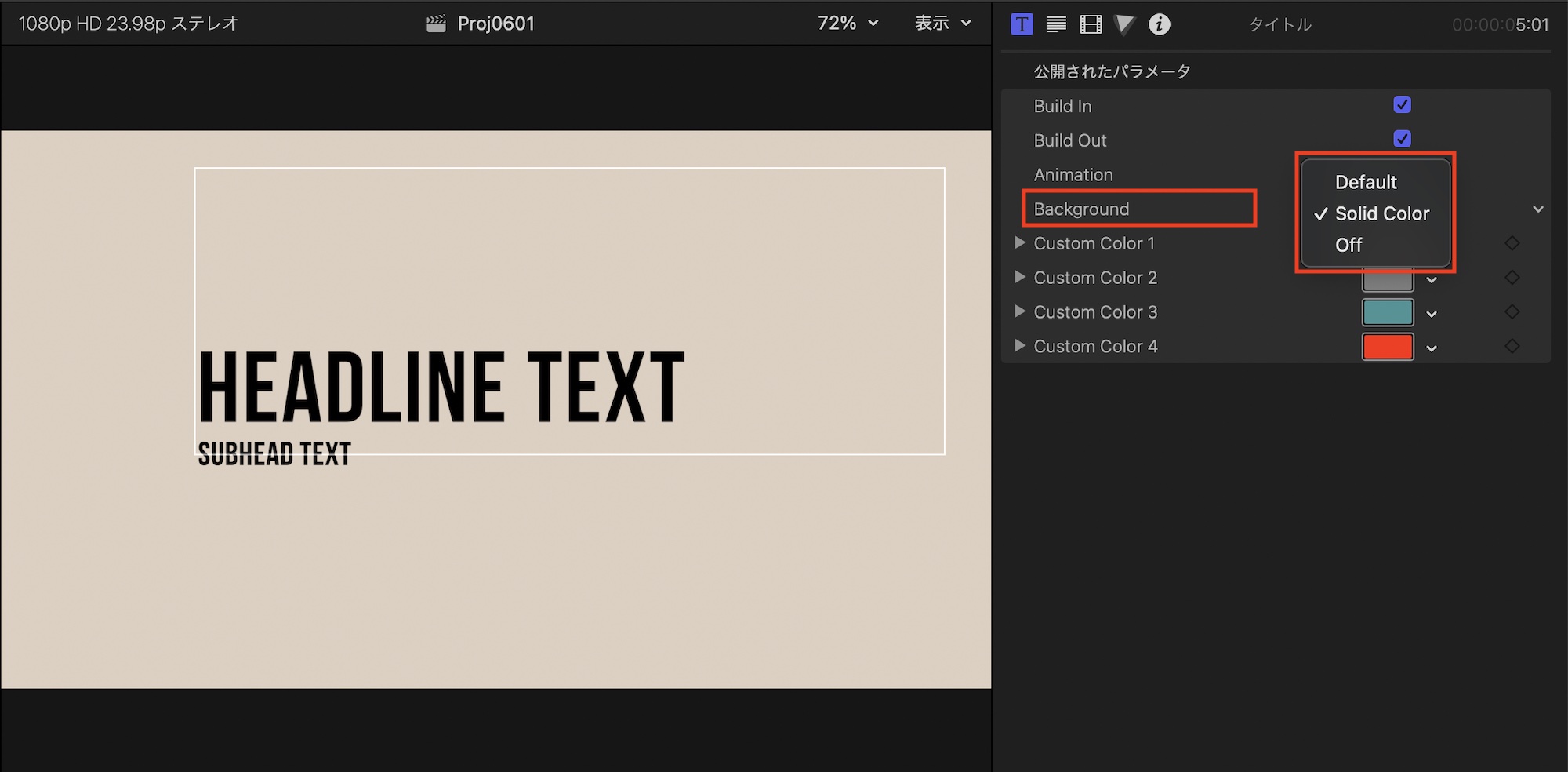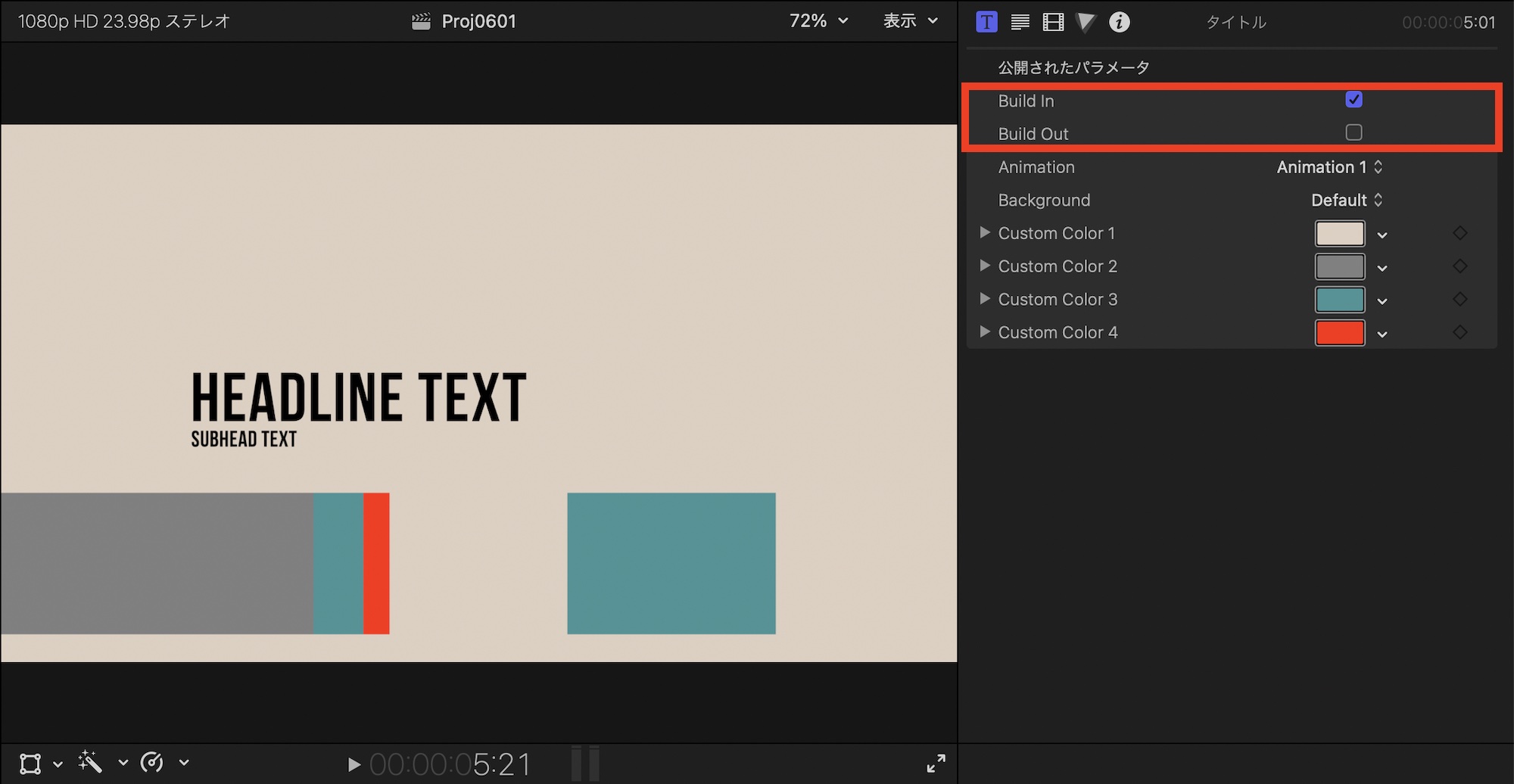 使用する動的タイトルにもよりますが、基本的に「Build In(ビルドイン)」、「Build Out(ビルドアウト)」、「Animation(アニメーション)」、「Background(背景)」、「Custom Color(カスタムカラー)」のパラメータが用意されています。