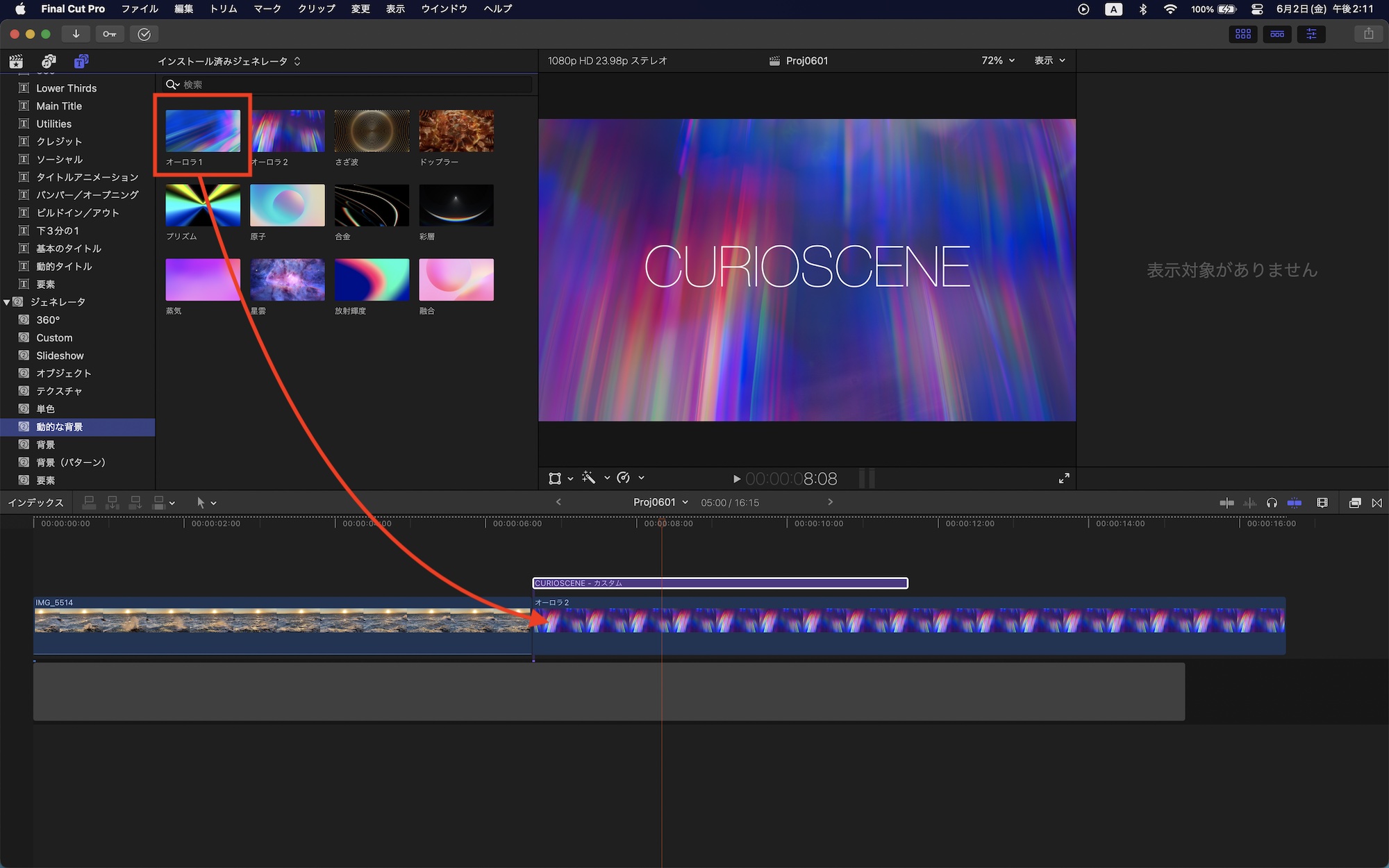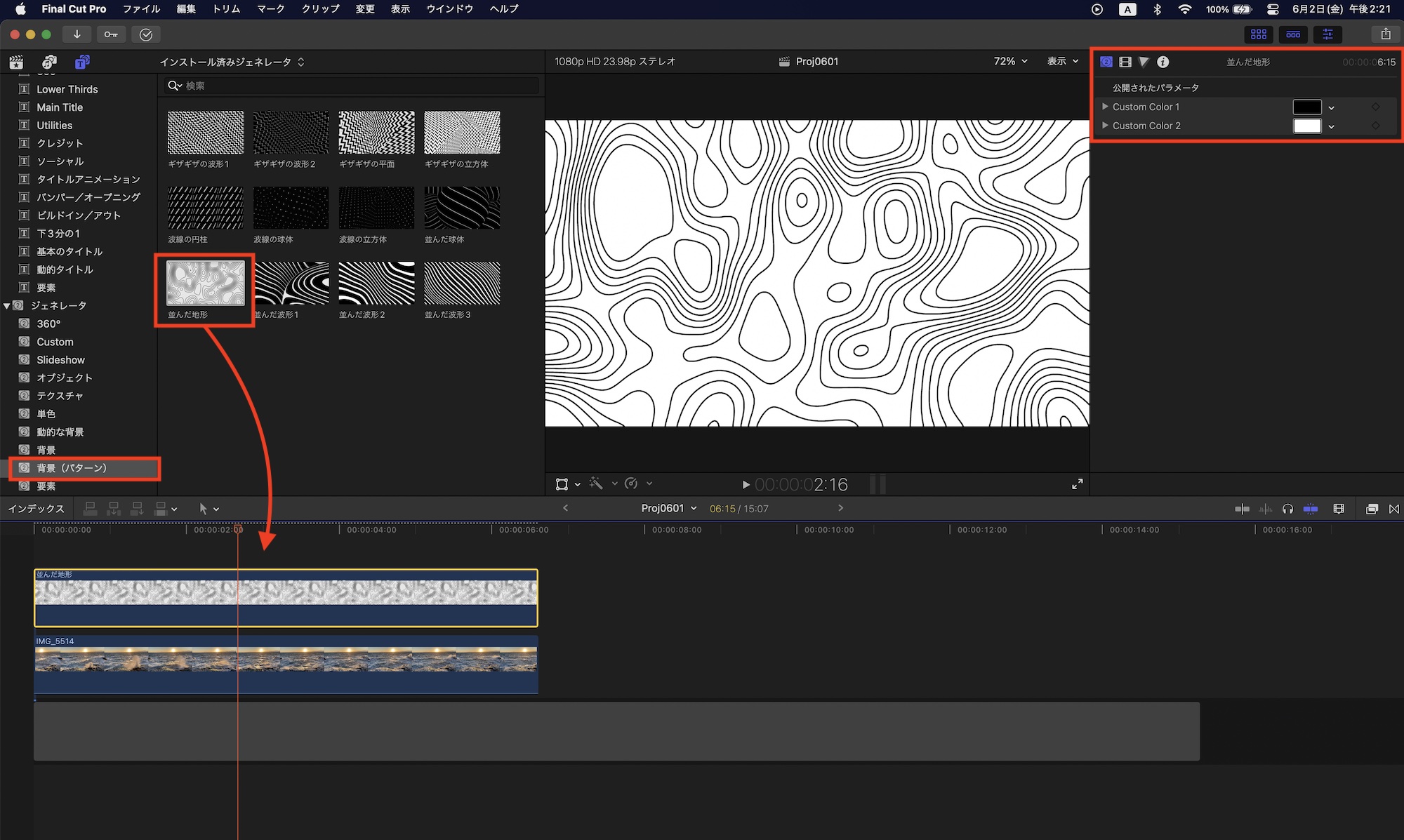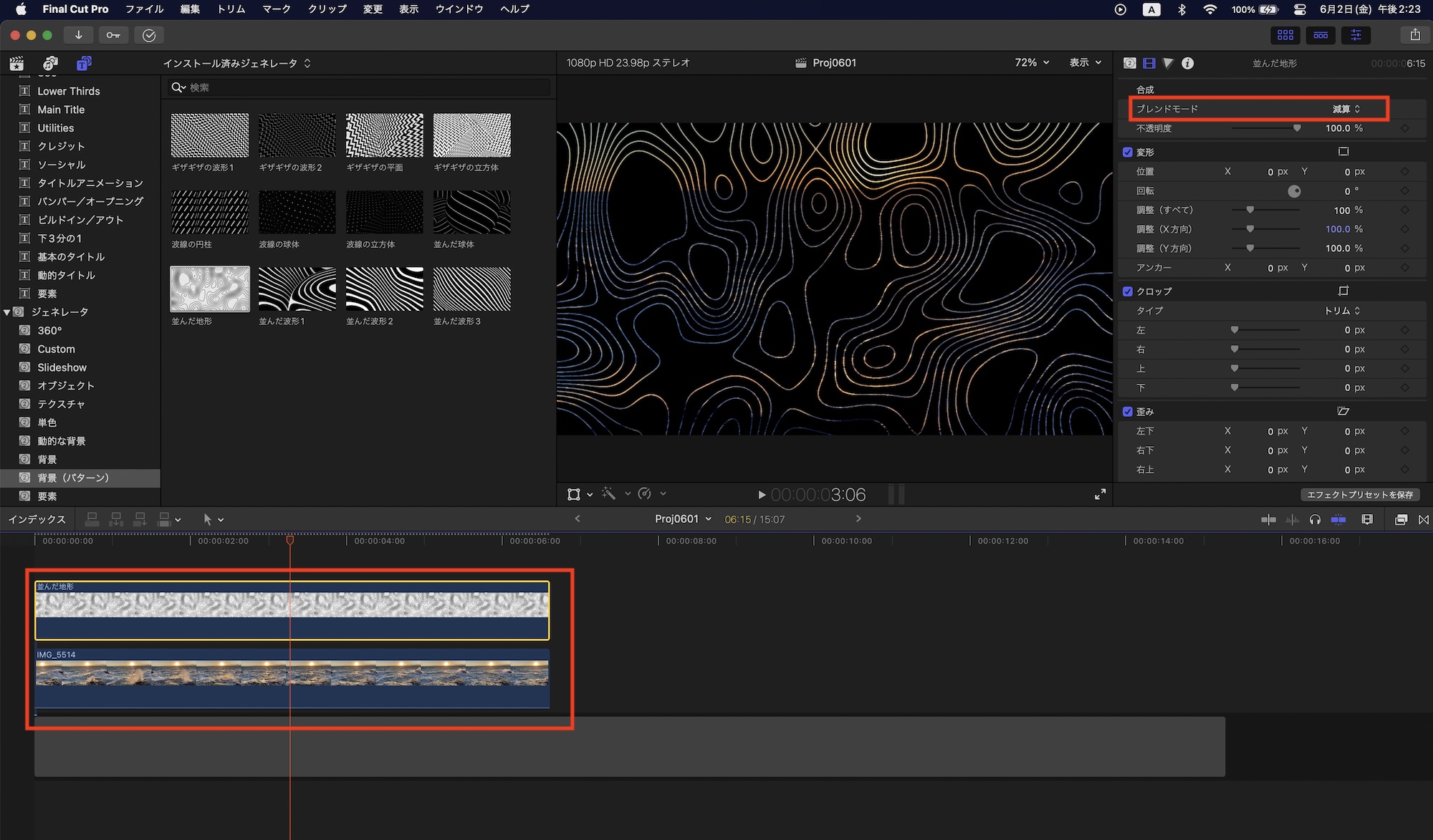 「動的な背景」と「背景(パターン)」はジェネレータなので、タイトルほどカスタマイズできる訳ではありませんが、タイムラインに追加した後で主に背景として使用したり、ブレンドモードを使って別のクリップに合成することもできます。