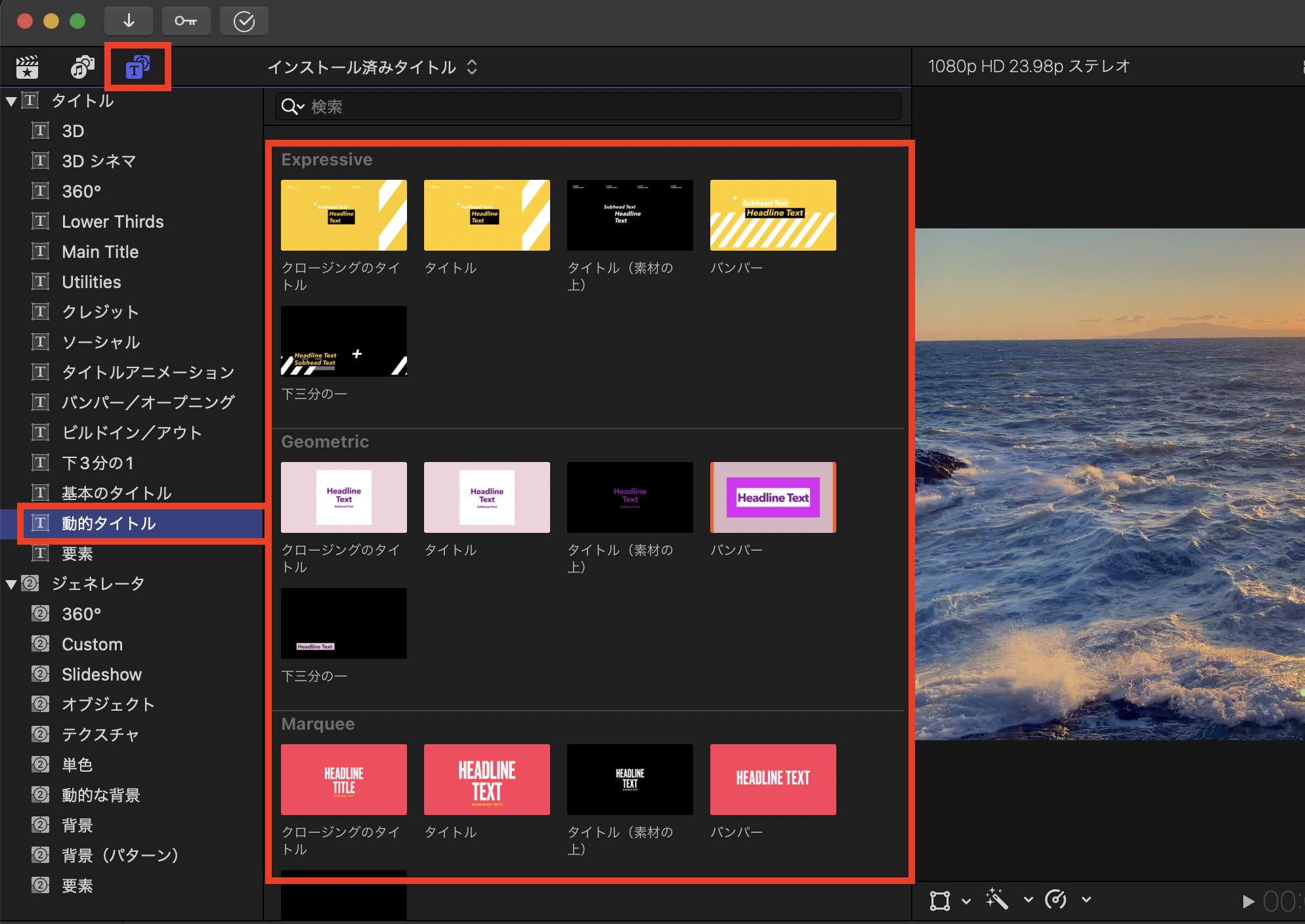 各カテゴリの中にイントロで使用できる「タイトル」やエンディングの「クロージングタイトル」、背景なしの「タイトル(素材の上)」、トランジションとタイトルを組み合わせた「バンパー」と人物の名前などで利用できるローワーサードの「下三分の一」が用意されており、これらをタイムラインに追加するだけで利用できます。