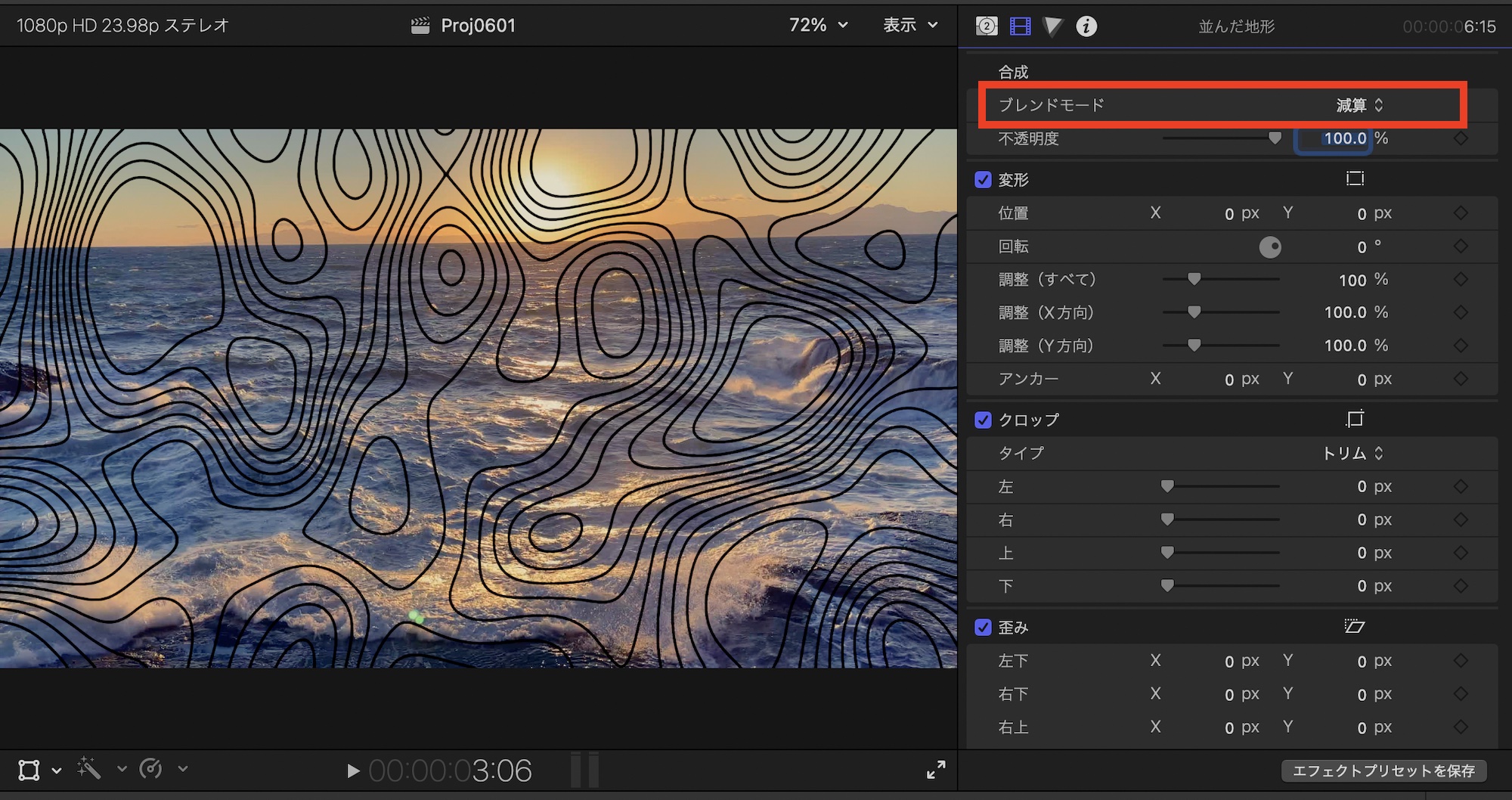 上の例では夕日のクリップの上に「並んだ地形」を追加し、並んだ地形のジェネレータのブレンドモードを「減算」にすると、白い部分が透明となり夕日のクリップが表示されるようになります。
