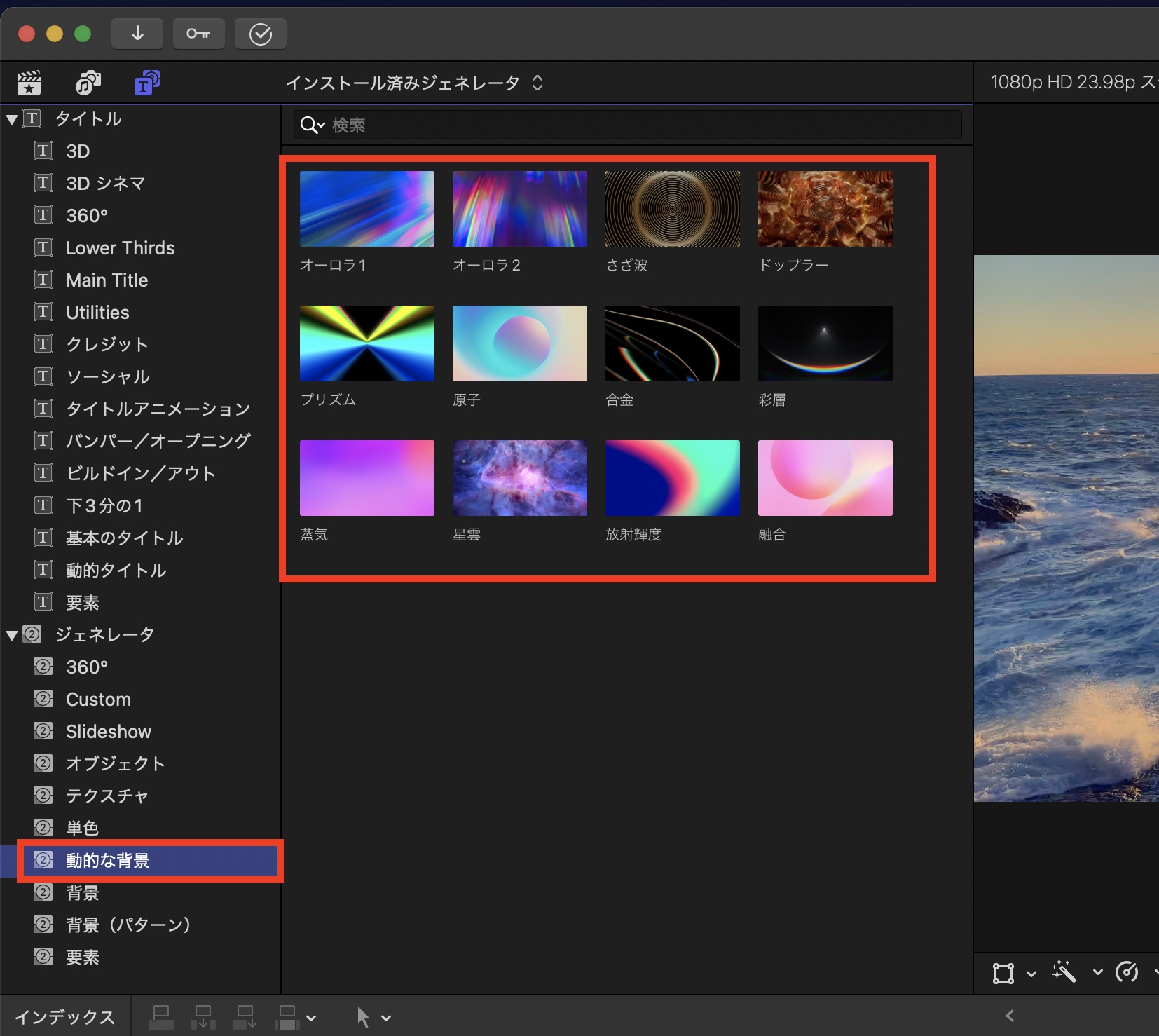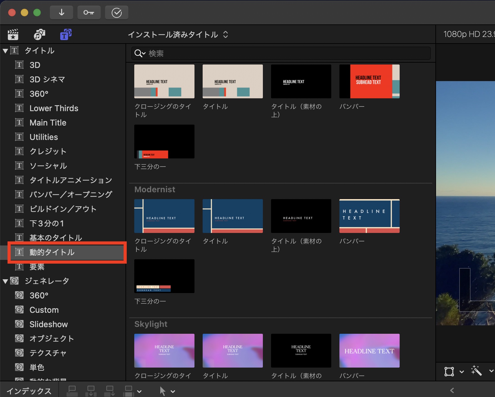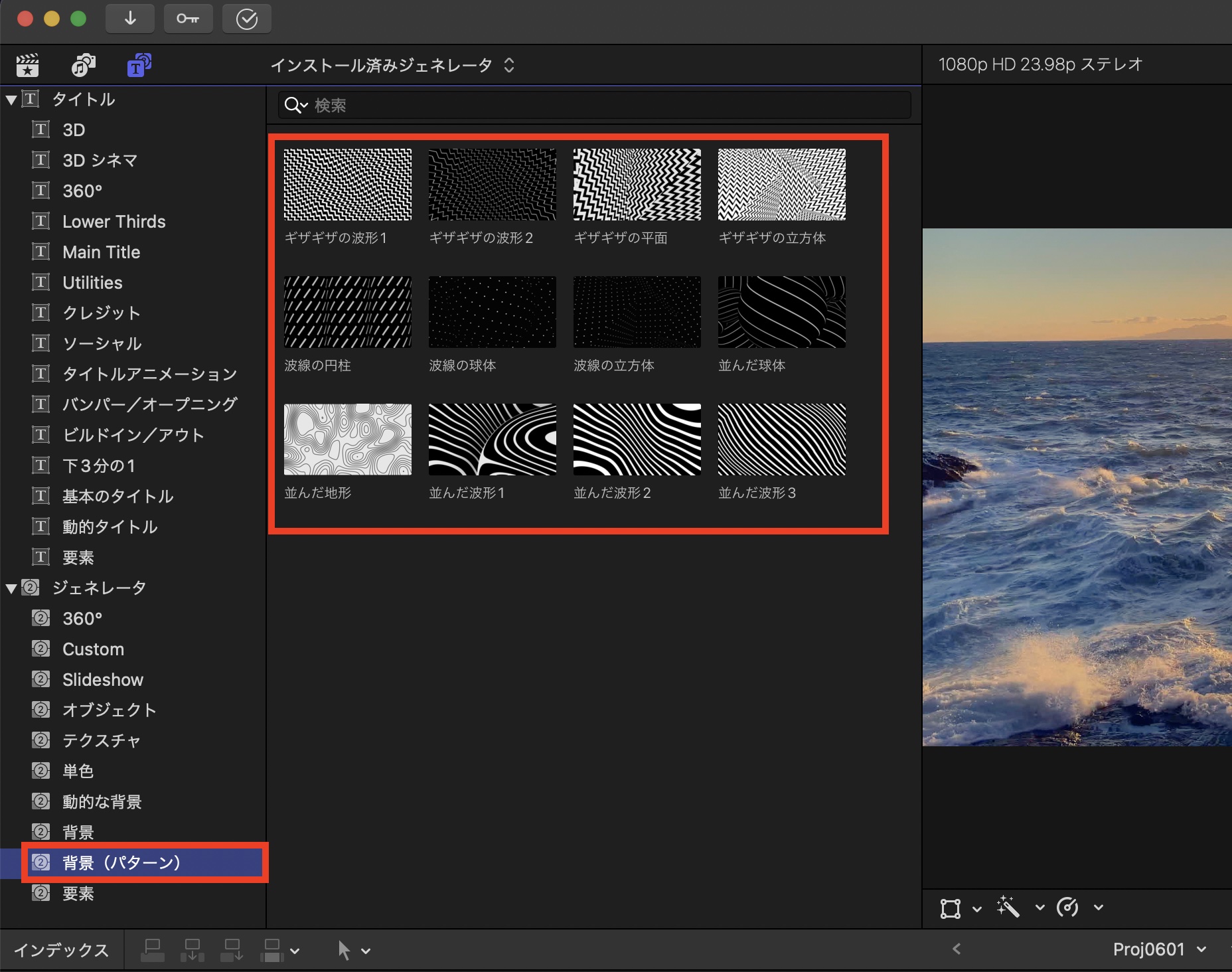 「動的タイトル」はタイトルとジェネレータサイドバーの「タイトル」の中ににあり、「動的の背景」と「背景(パターン)」は「ジェネレータ」の中にあるので、それぞれタイトルまたはジェネレータとしてタイムライン(プロジェクト)に追加可能です。