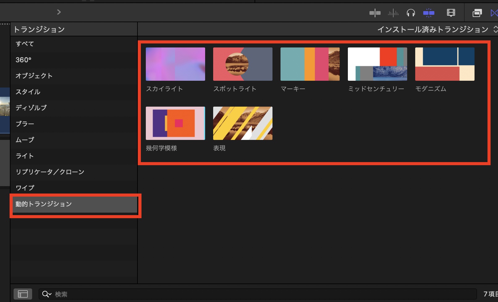 「動的トランジション」はトランジションブラウザに独立したカテゴリとして追加されており、クリップに追加することでトランジションを適用できます。