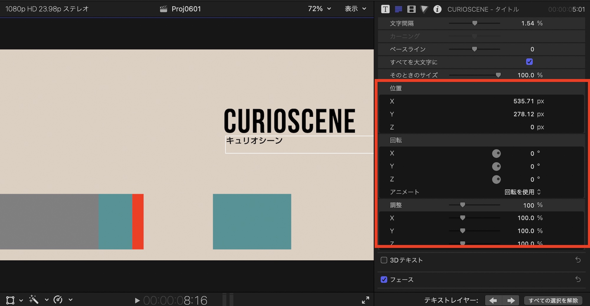 この際テキストインスペクタが表示されるので、そこからテキストを変更したり、フォントやサイズ色なども調整できます。テキストの位置や回転の調整は「位置」、「回転」、「調整」から行えます。テキストの細かな調整方法については「タイトルツールを使ってテロップや字幕などを作成する方法」で紹介しているので、合わせてチェックしてみてください。