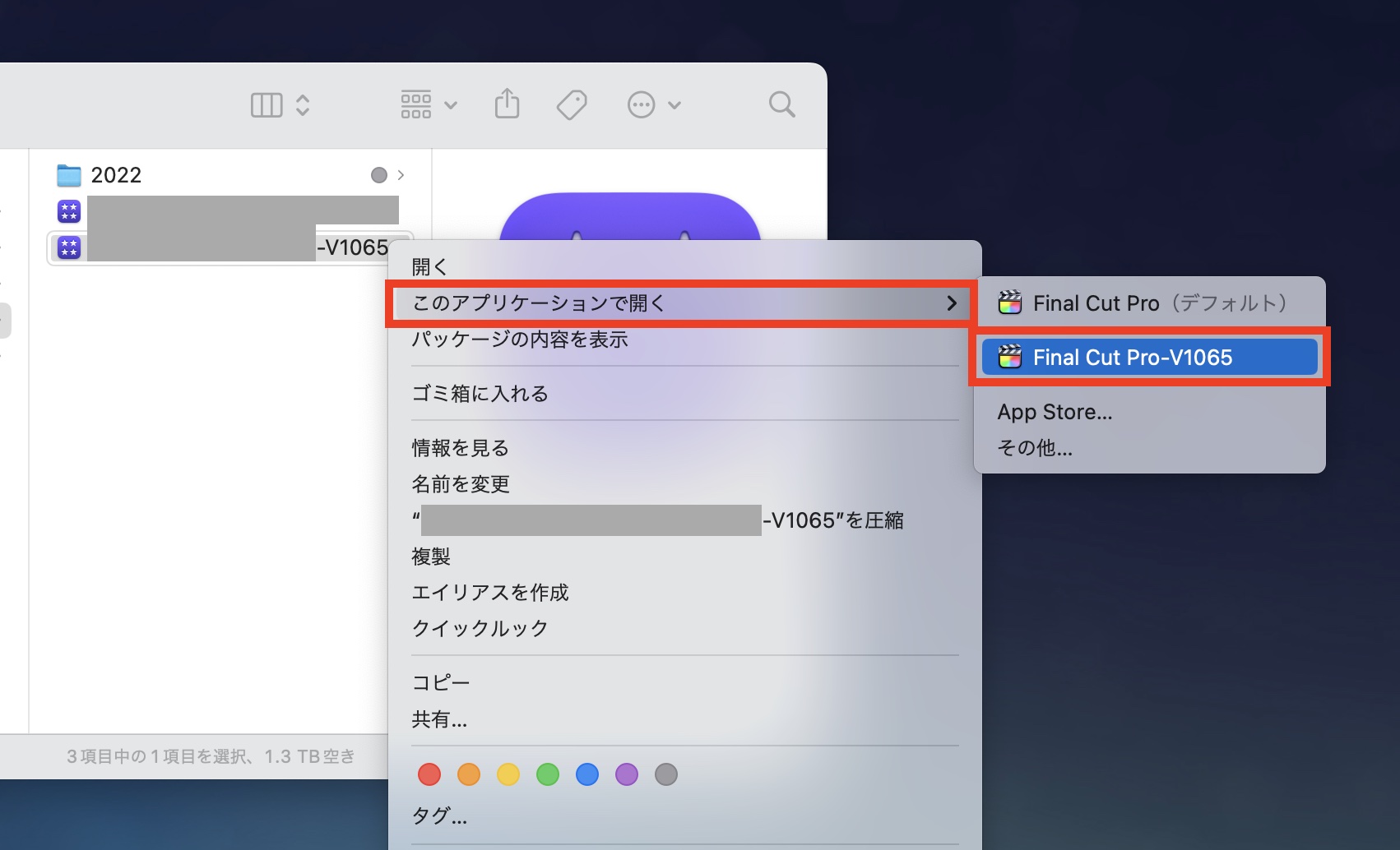 前の項目でも説明していますが、バックアップを行ったライブラリでもダブルクリックすると新バージョンのFinal Cut Proが起動するため、旧バージョンのFinal Cut Proで開きたい場合は右クリック、「このアプリケーションで開く」から、旧バージョンののFinal Cut Proを選択しましょう。