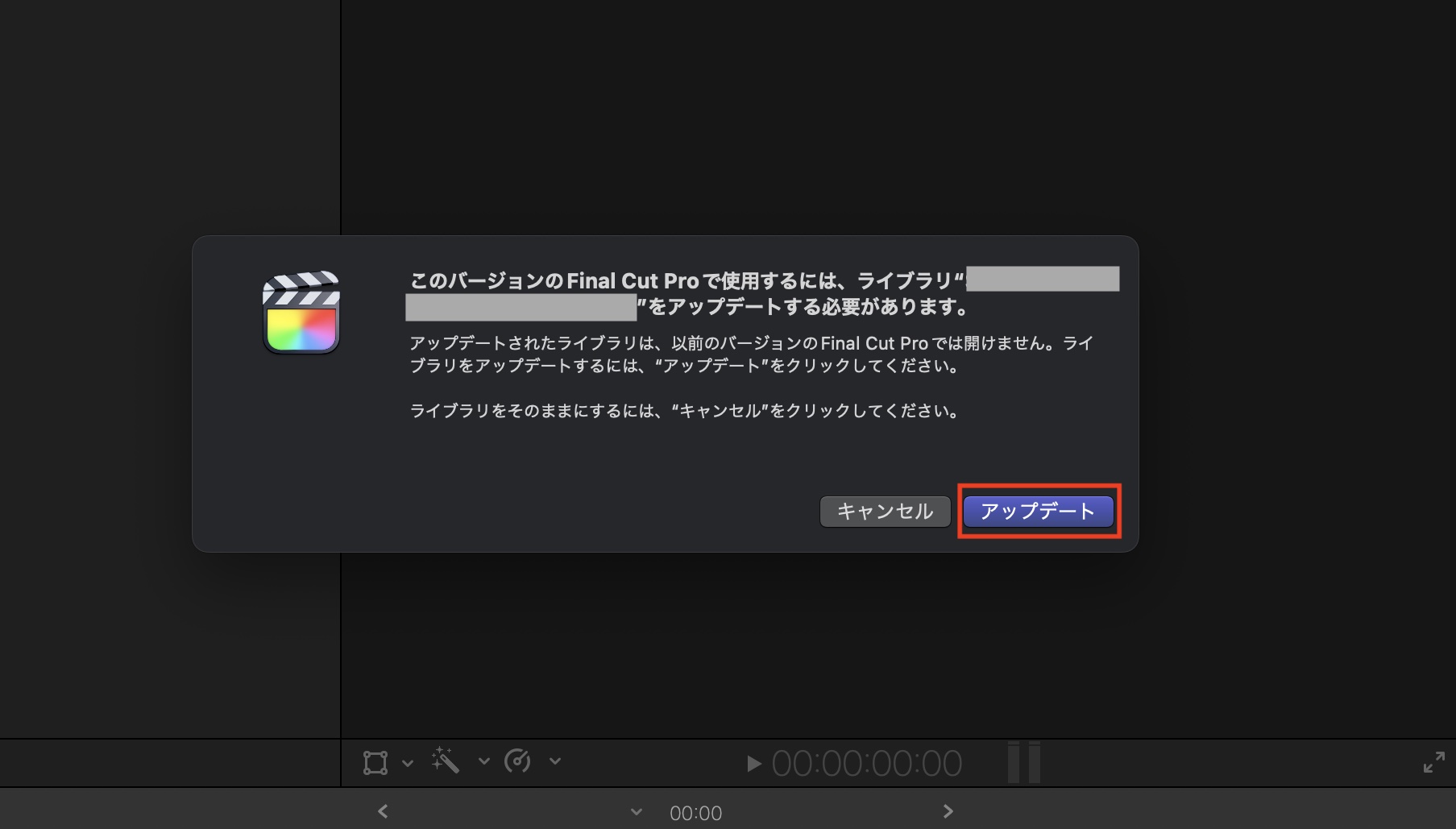 旧バージョンのFinal Cut Proとライブラリをバックアップした上で、オリジナルのFinal Cut Proライブラリを開くと、「このバージョンのFinal Cut Proで使用するには、ライブラリ”ライブラリ名”をアップデートする必要があります。」が現れ、ライブラリのアップデートを求められます。