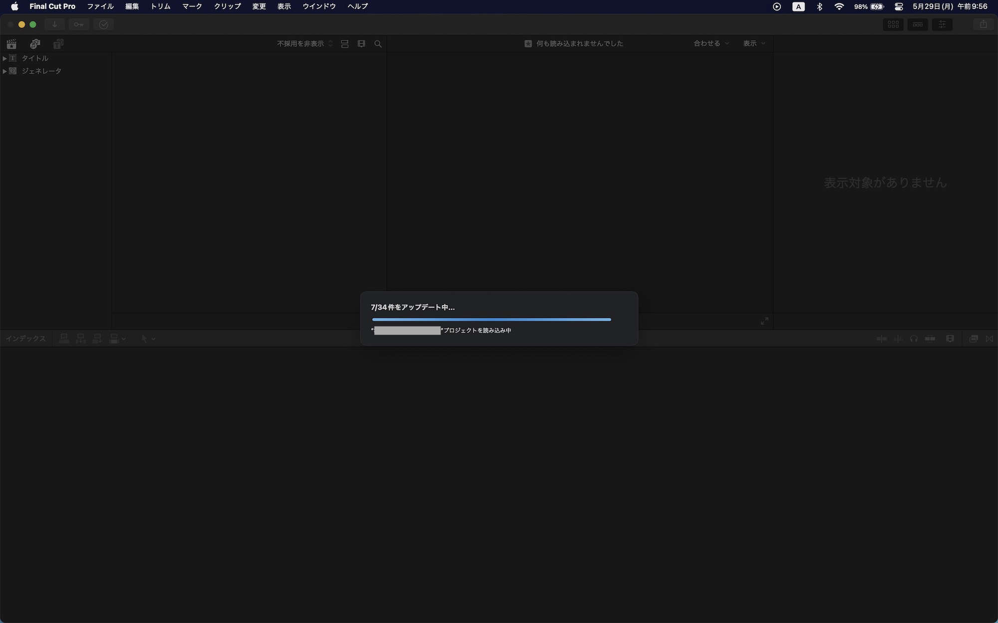 「アップデート」をクリックすると自動でライブラリが更新されるのですが、ライブラリにあるメディアやタイムラインの多さなどによっては、更新に時間がかかる場合があります。
