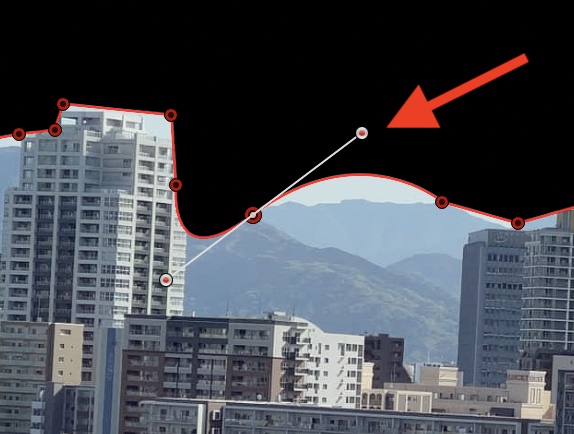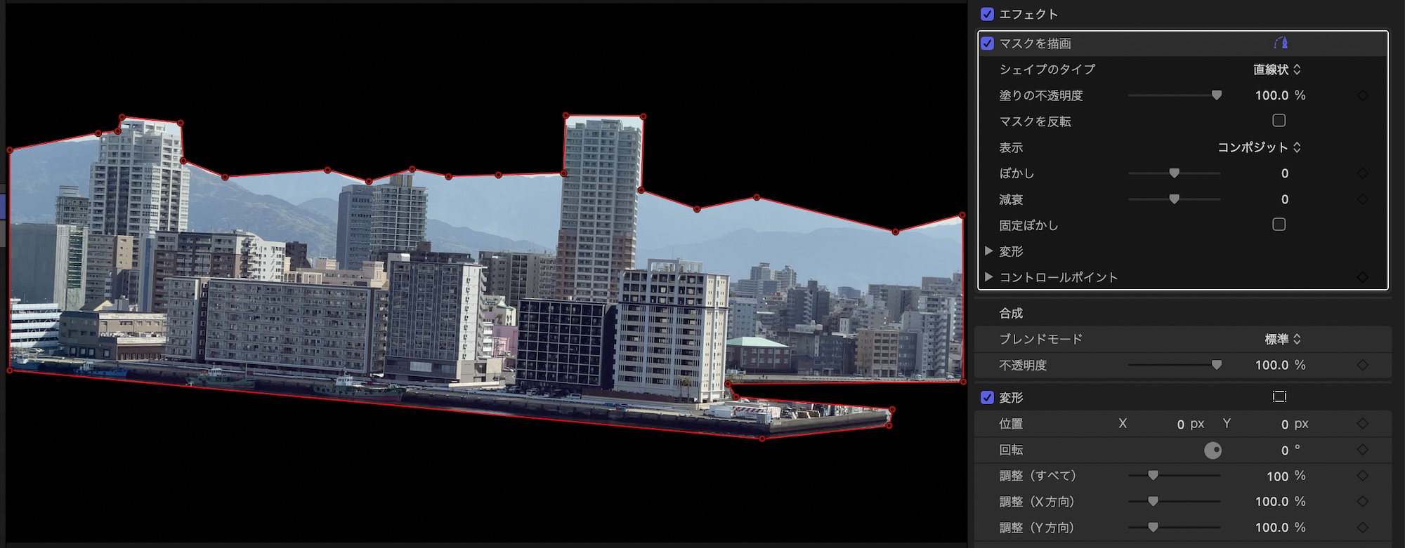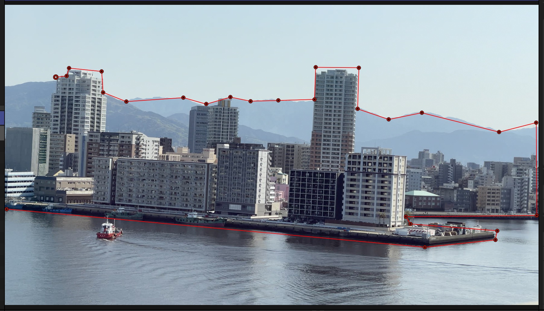 エフェクトを追加しても何も起きませんが、ビューアで「クリックしてコントロールポイントを追加」と表示されているので、マスクしたい範囲をペンツールで選択していきます。今回は街と山をマスクしたいので、形に合わせてマスクを作成してみました。